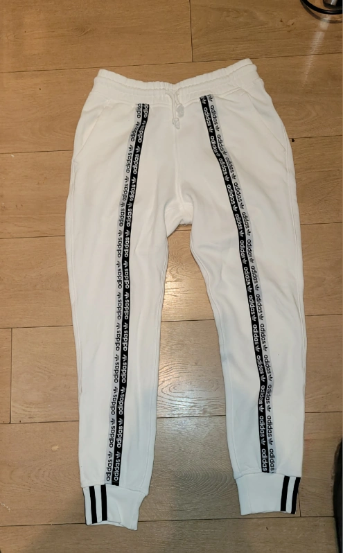 Adidas R.Y.V. Taped Joggers in crisp white terry cotton. Super comfy and unique design with signature R.Y.V. Adidas “Tape” (ribbon) up front of legs. These are impossible to find and retail for about $100.