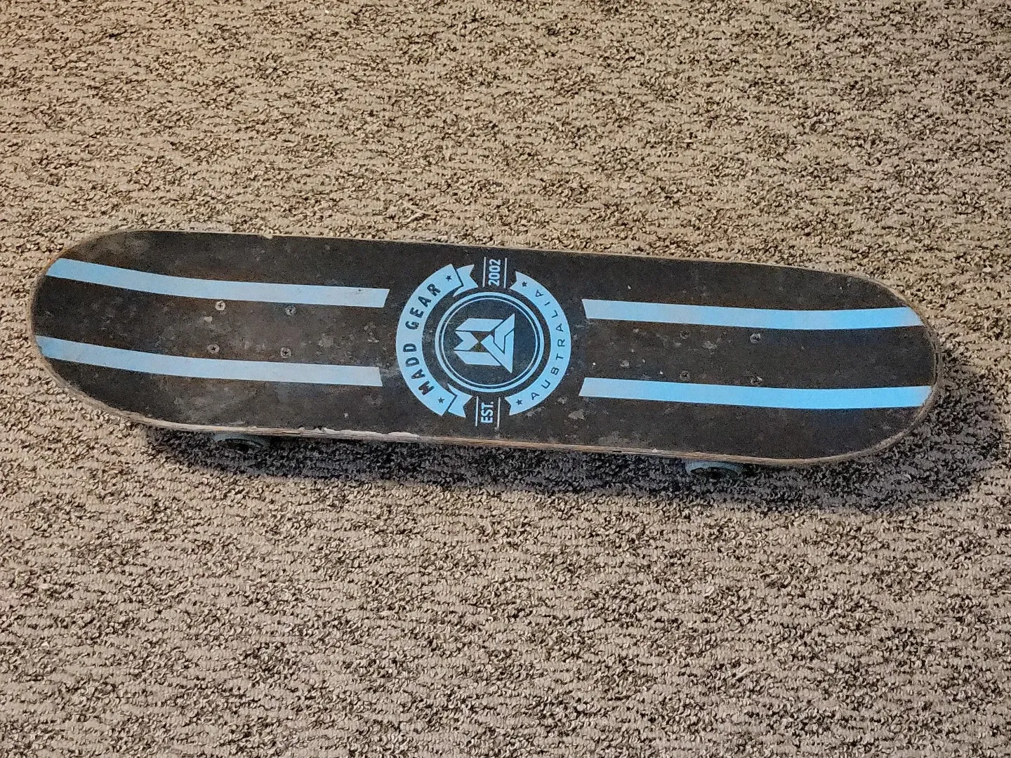 This is a Madd Gear skateboard with a cool skull graphic on one side and blue stripes on the other. It's ready for cruising or tricks! Wood deck, metal trucks, and blue wheels.