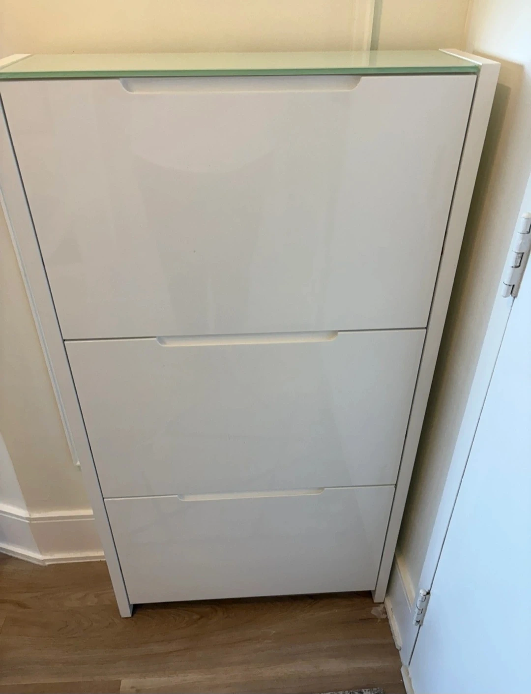 Selling a white shoe cabinet that's in great shape! It has a sleek design and a glass top, adding a touch of elegance to your entryway or closet. Perfect for keeping your shoes organized and out of sight.