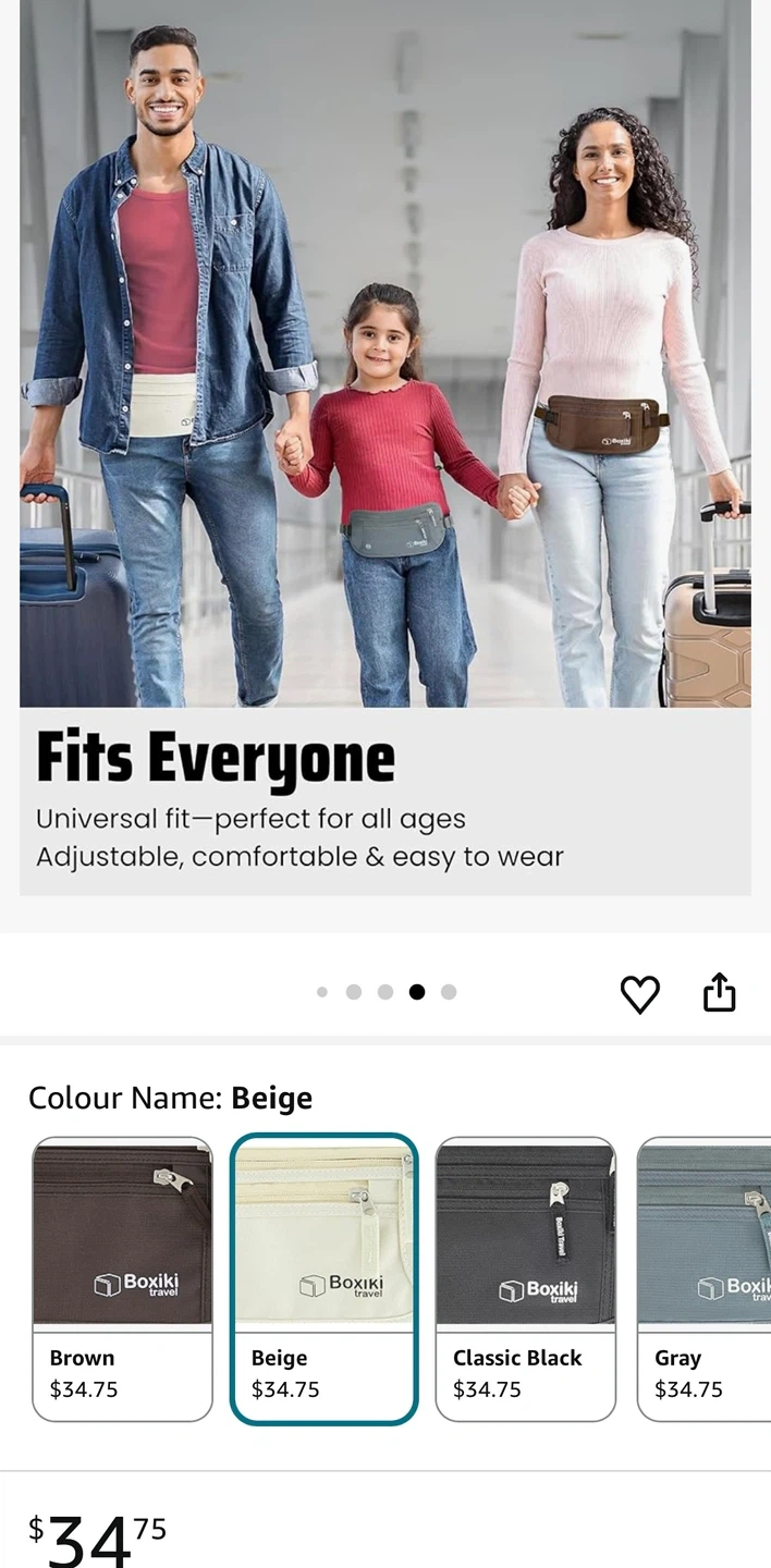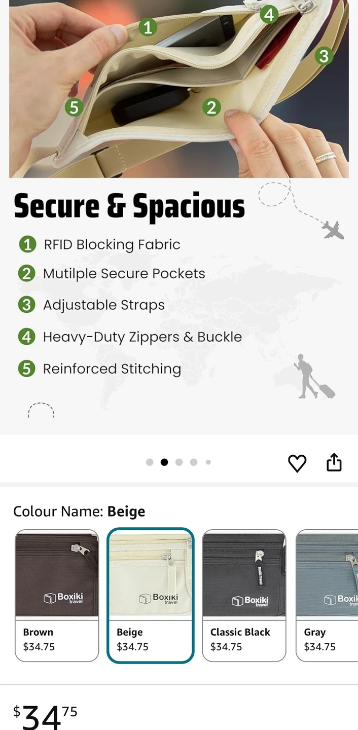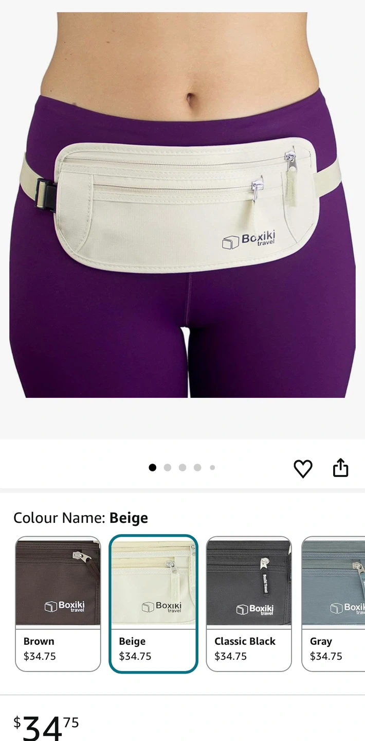This new unused Boxiki Travel money belt is beige and features RFID blocking fabric. It has multiple secure pockets and adjustable straps with heavy-duty zippers and buckle. Reinforced stitching ensures durability. Secure your valuables on trips and theme parks!