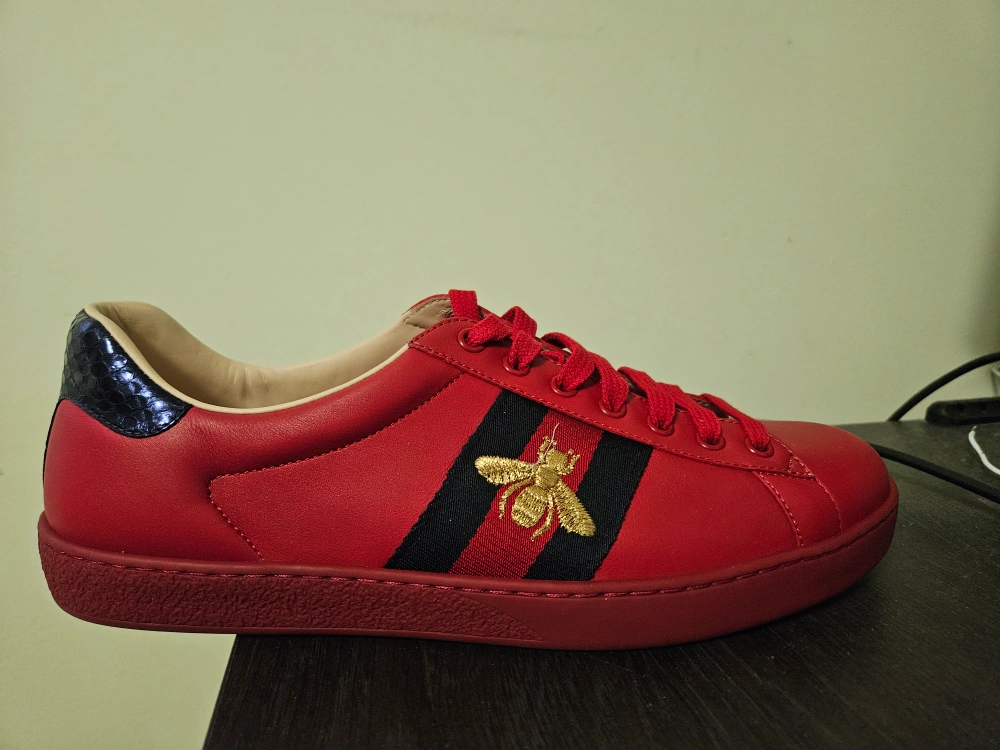 Red leather low-top sneakers from Gucci with the signature bee embroidery. Includes the original box and dust bag. These sneakers are a classic choice for a stylish look.