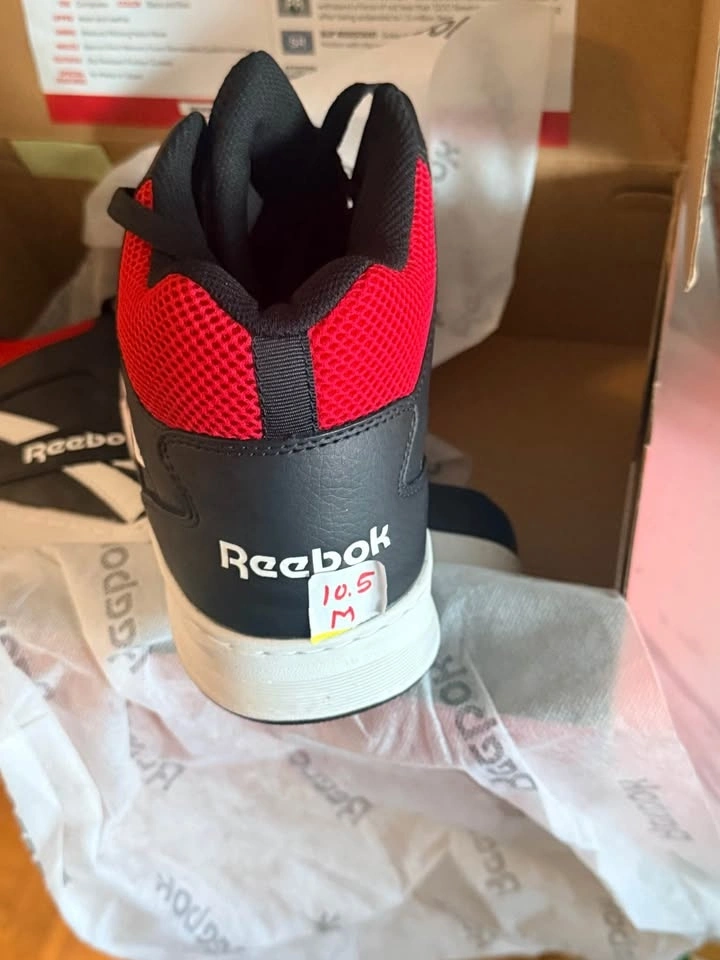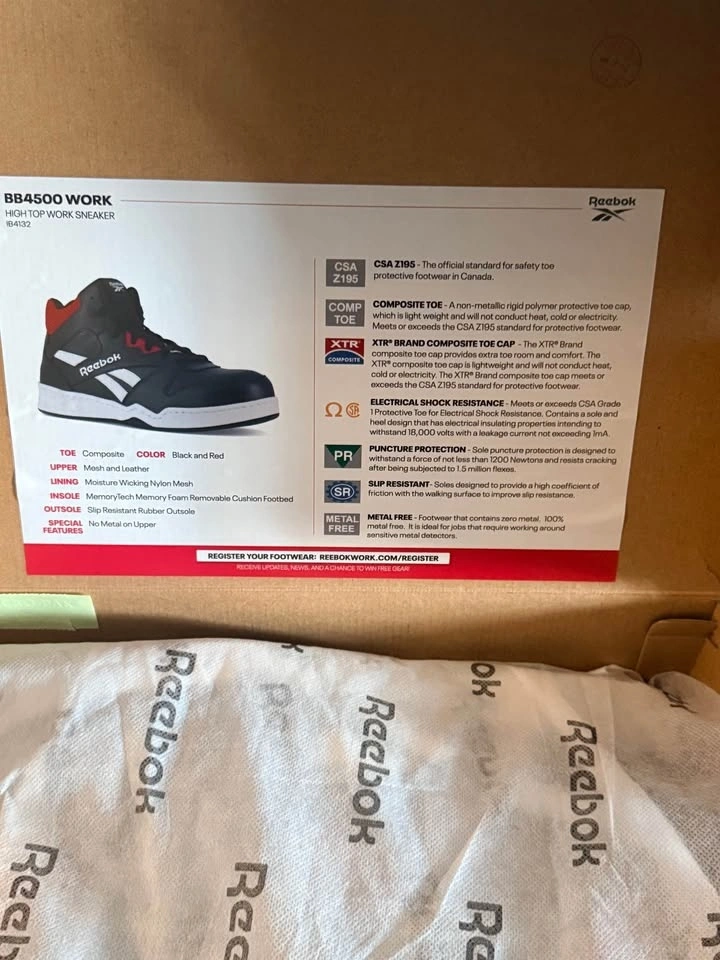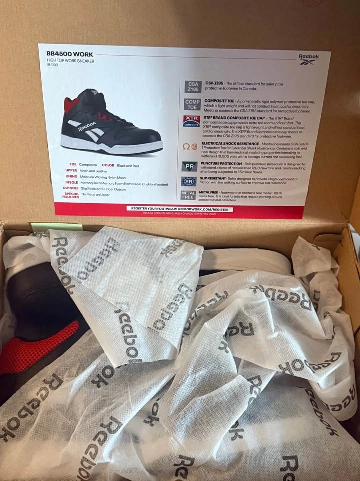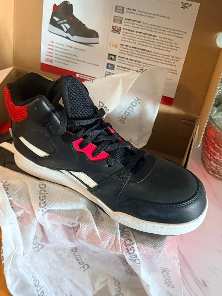Protective Reebok BB4500 Work high top sneakers in black and red. Features composite toe, electrical shock resistance, puncture protection, slip resistance, and a metal-free design. Comes in original box. Pickup at Kipling and Steels.