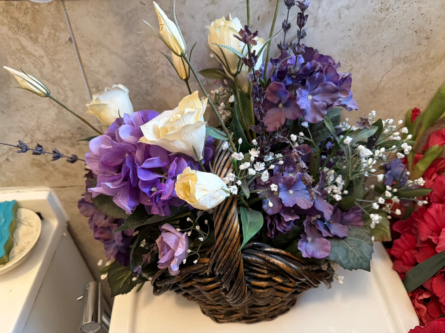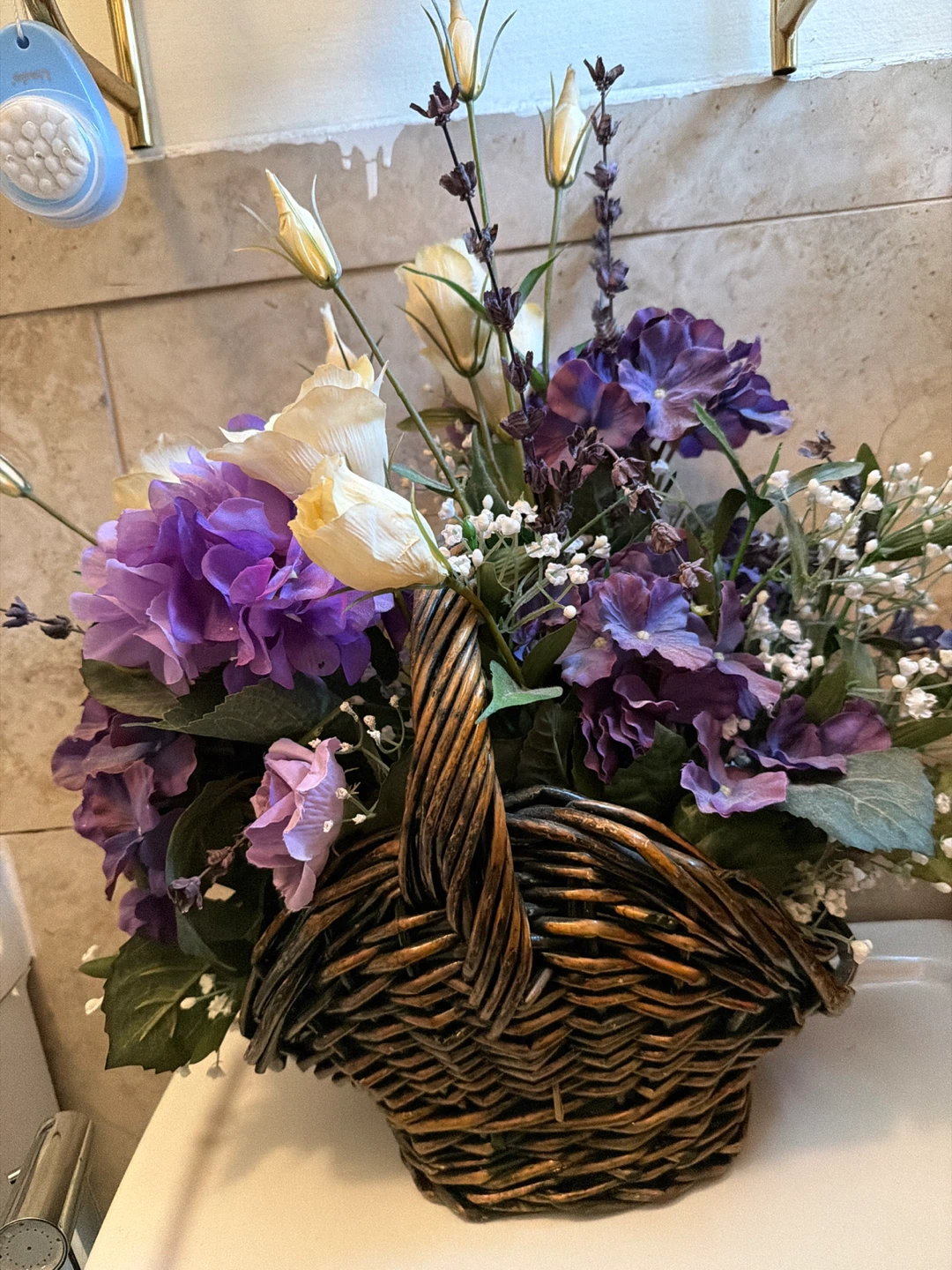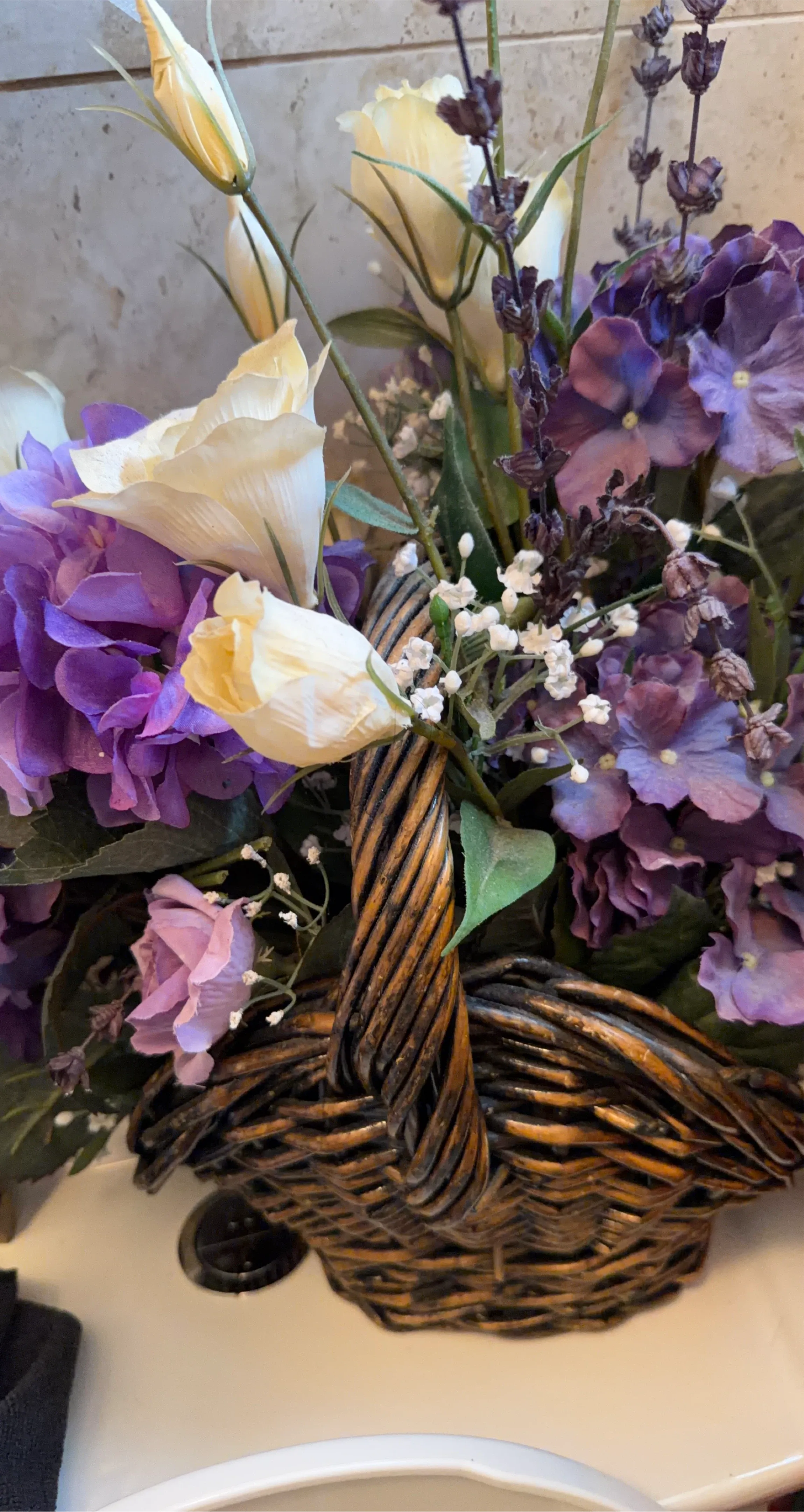 This is a lovely floral arrangement in a woven basket. It features a mix of purple and white flowers, adding a touch of elegance to any space. Perfect for home decor or as a gift!