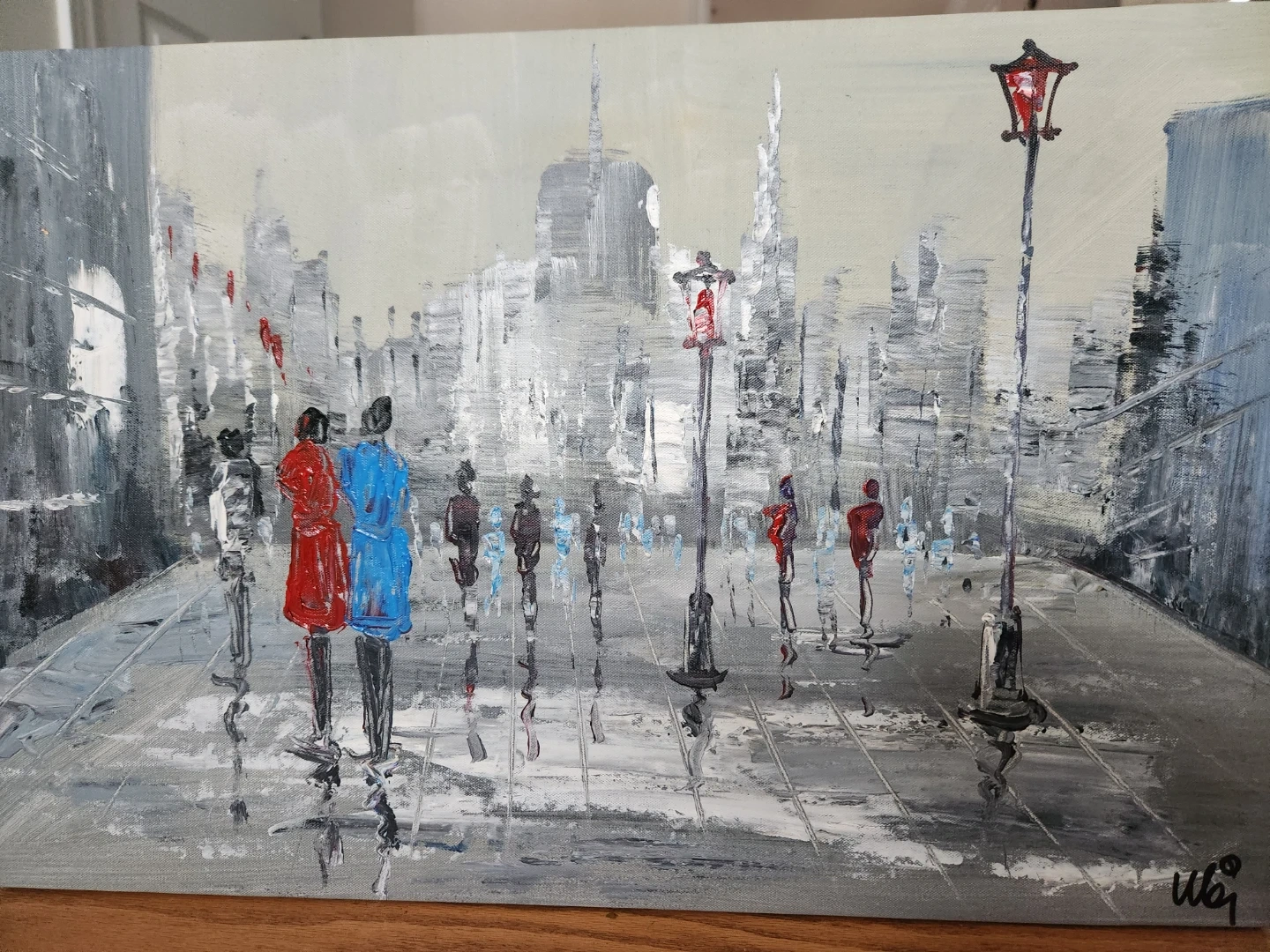 Acrylic painting depicting a city street scene with people and lampposts. Features bold brushstrokes and a monochromatic palette with red accents. The artwork has a signed artist's mark in the bottom right corner. 61 by 41 cm