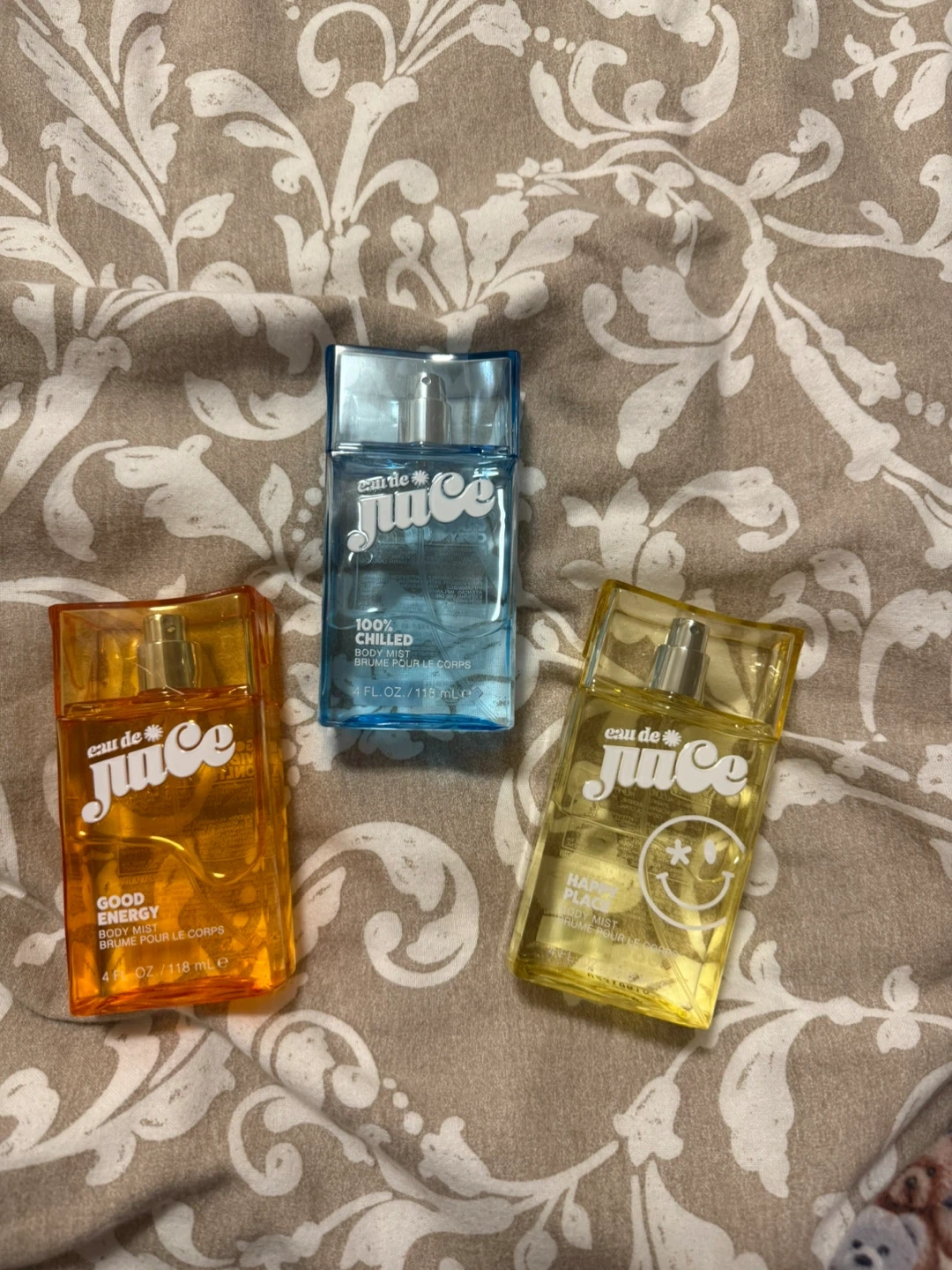 This set includes three Eau de Juice body mists: Good Energy, 100 Chilled, and Happy Place. Each bottle contains approximately 4 FL. OZ. / 118 mL. Slightly used.