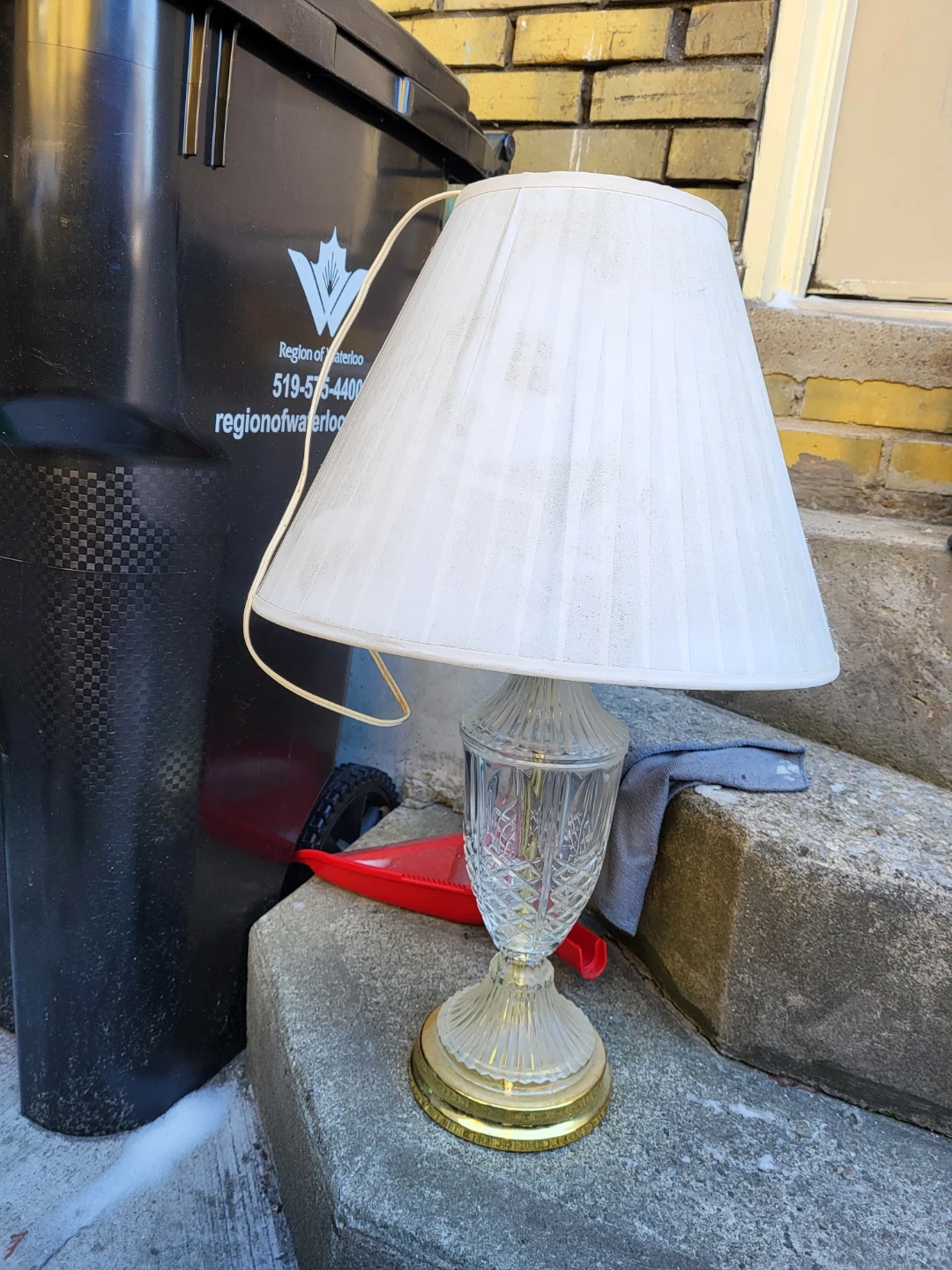 A decorative table lamp featuring a clear, cut-glass base with gold accents. It comes with a white pleated lampshade that shows some light wear.