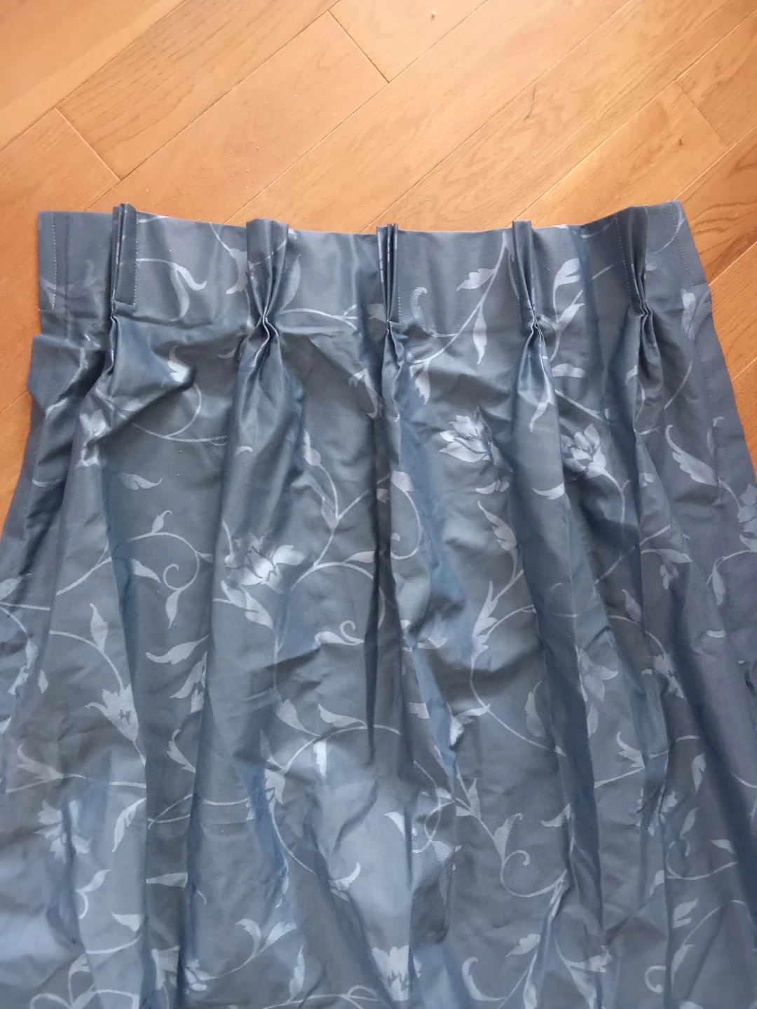 Two curtains with a blue floral pattern. Face is 100% polyester and the back is 100% acrylic. Made in Canada.