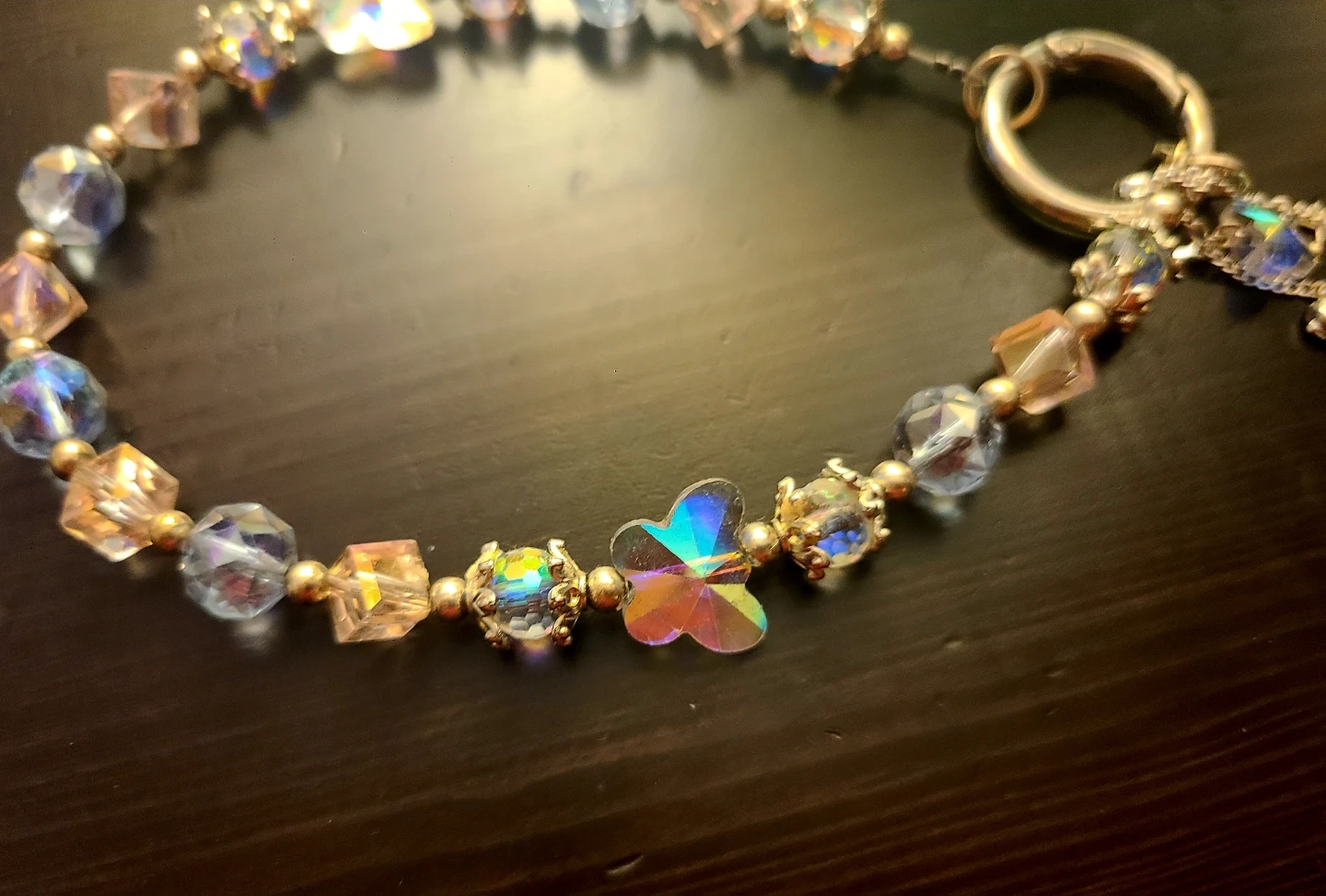 This sparkly keychain features a colourful butterfly charm and assorted crystal beads. It also has dangling chains with star charms. It's great for adding some flair to your keys, phone, or bag!