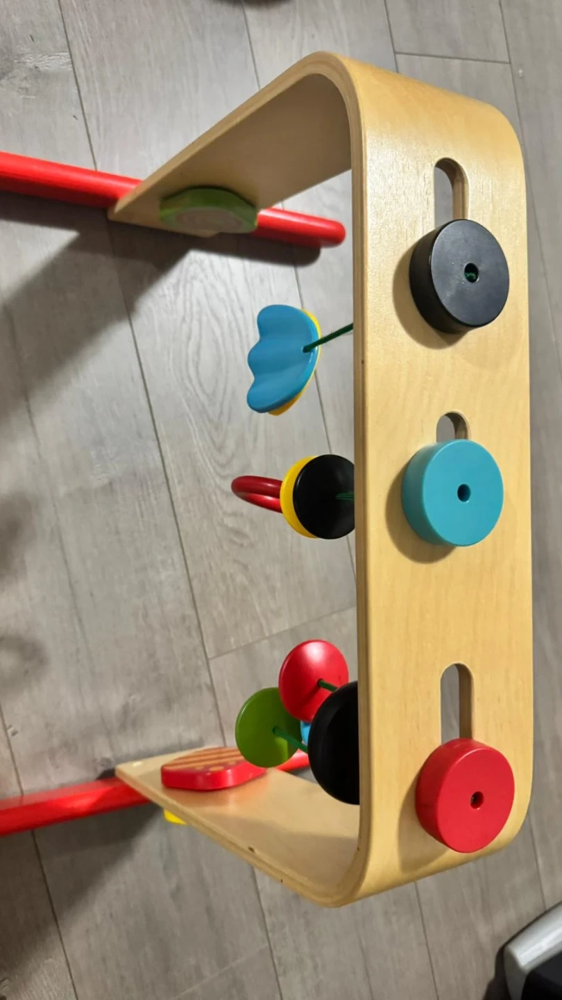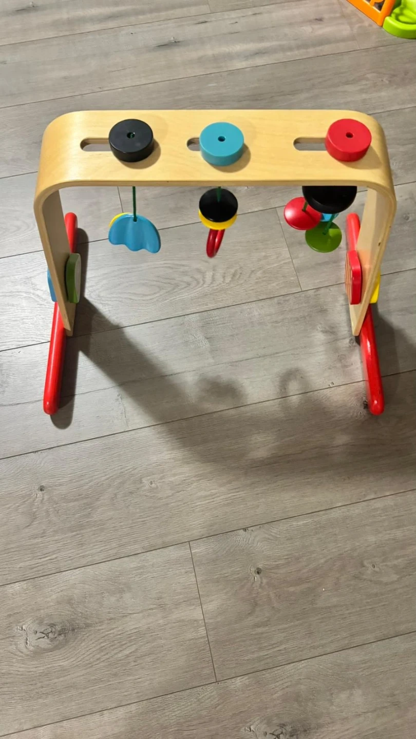 This wooden activity gym features colourful spinning toys and textures for baby's engagement. It's designed for little ones to explore and develop fine motor skills. The sturdy wooden frame ensures durability.