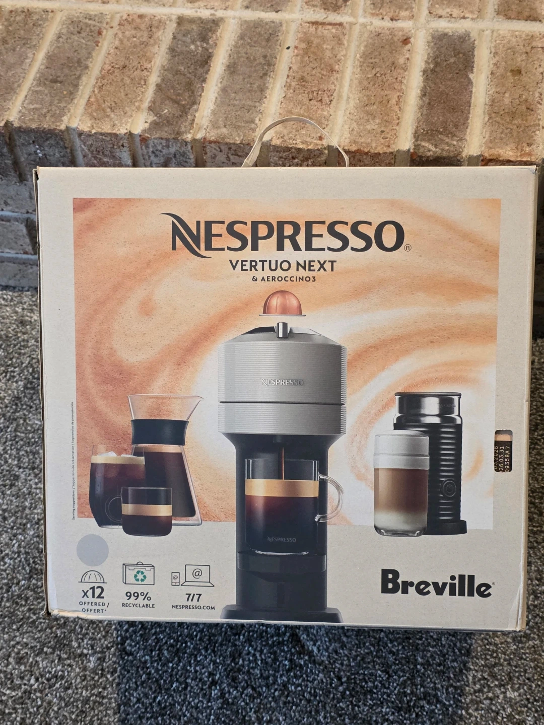 Selling a Nespresso Vertuo Next & Aeroccino3 by Breville! It comes with the box and is in great condition. This machine is 99% recyclable and offers 12 pods. Enjoy delicious coffee with this convenient set!
