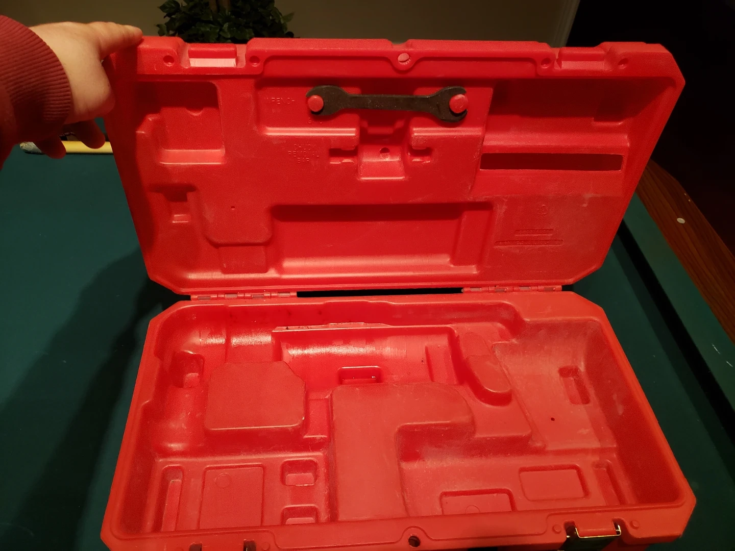 This is a red Milwaukee tool case. It has custom molded interior for secure storage. Latch closure keeps contents safe. It's suitable for organizing and transporting tools.