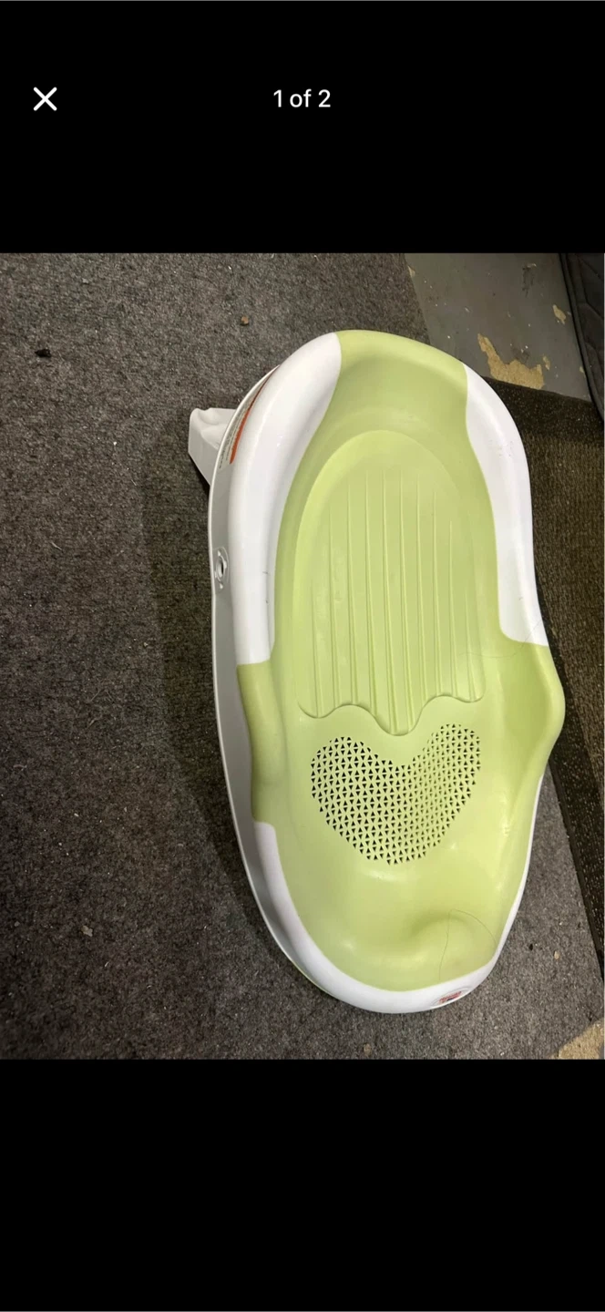 This is a baby bath seat in white and light green. It's designed to help support infants during bath time. The seat has a contoured shape with drainage holes.