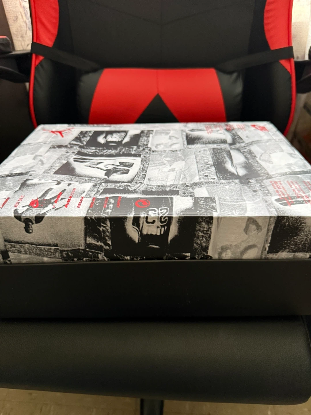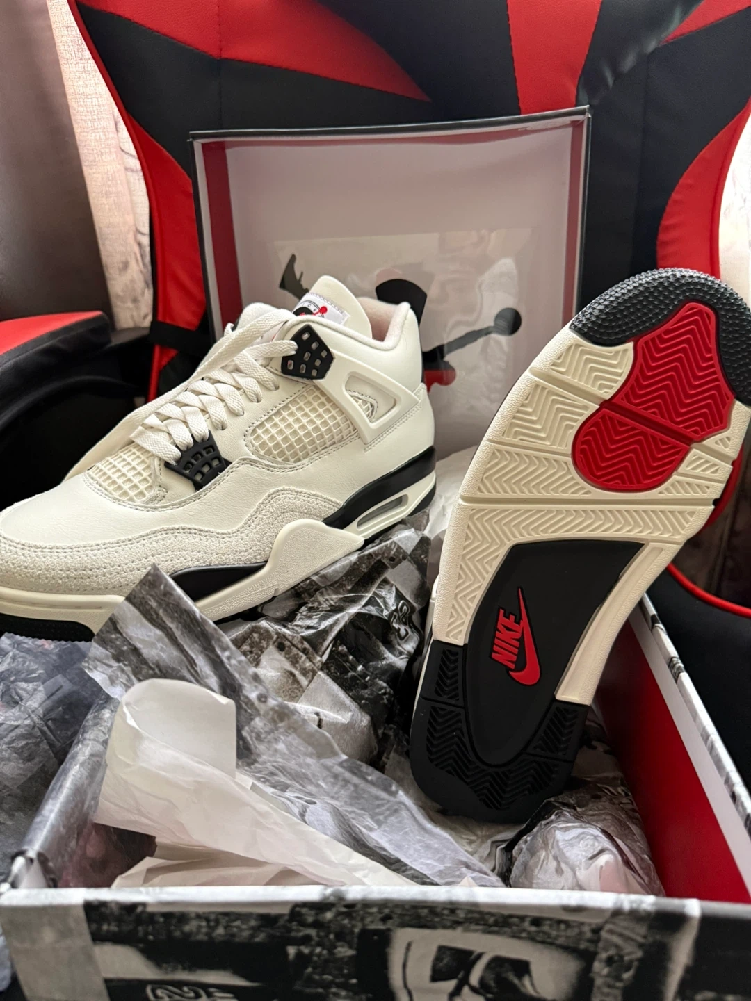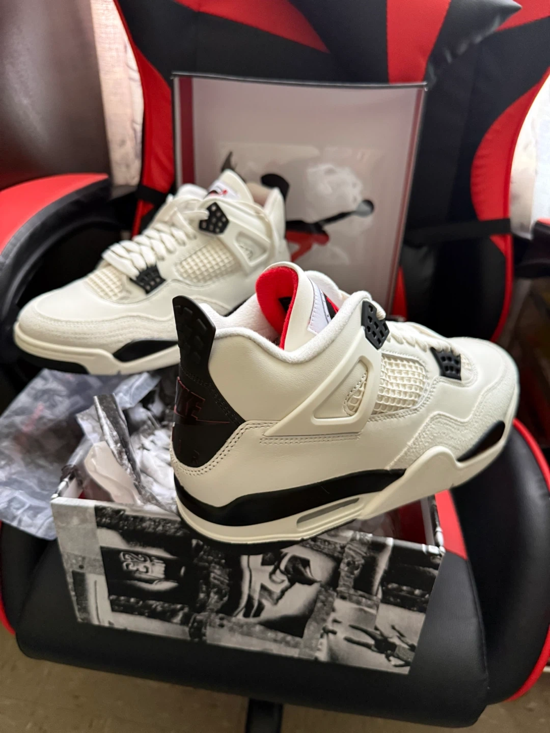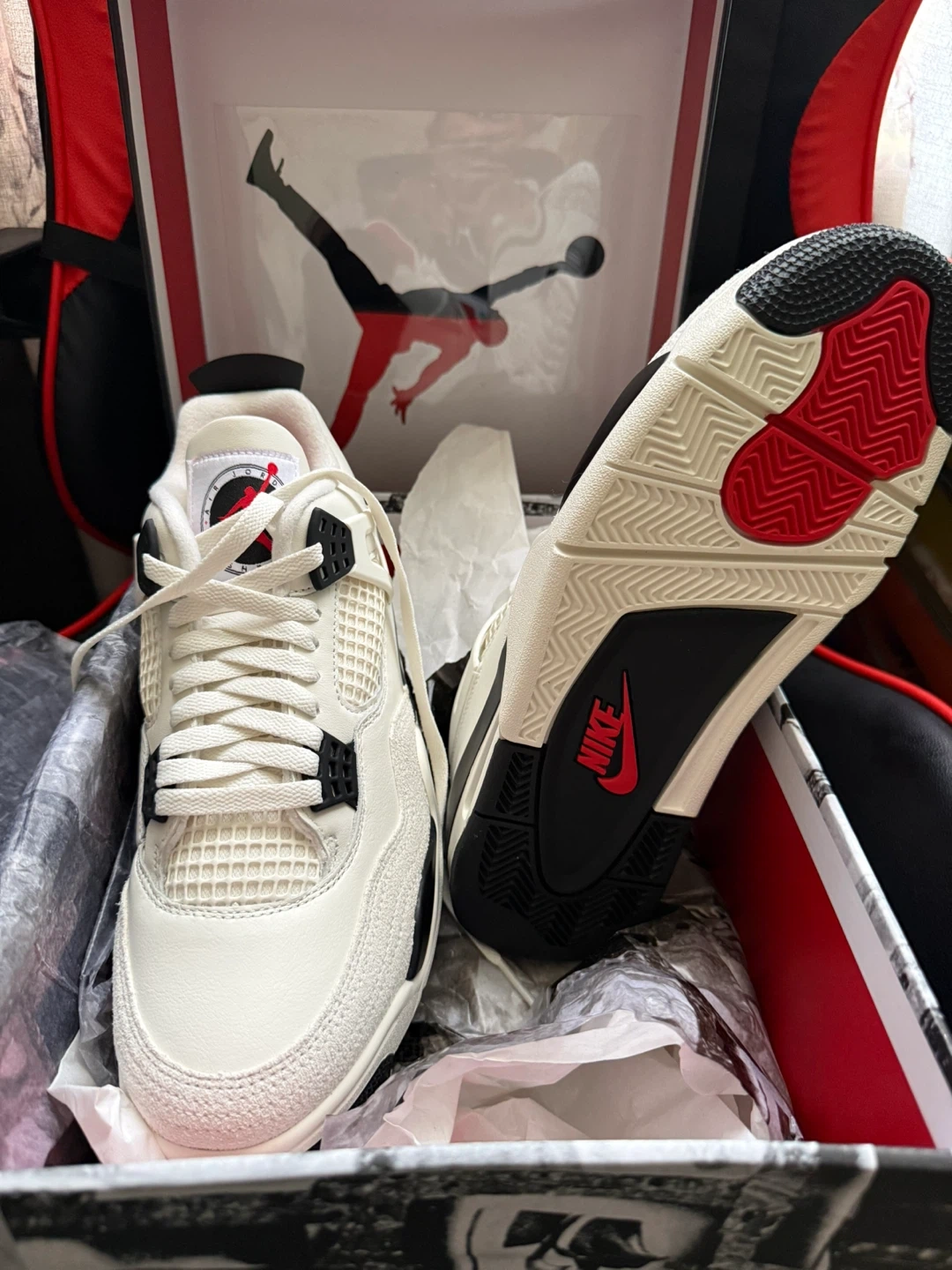 Iconic Jordan 4 "White Cement" sneakers are ready for a new home. They feature a white leather upper with black and red accents. Includes the original box and packing paper.