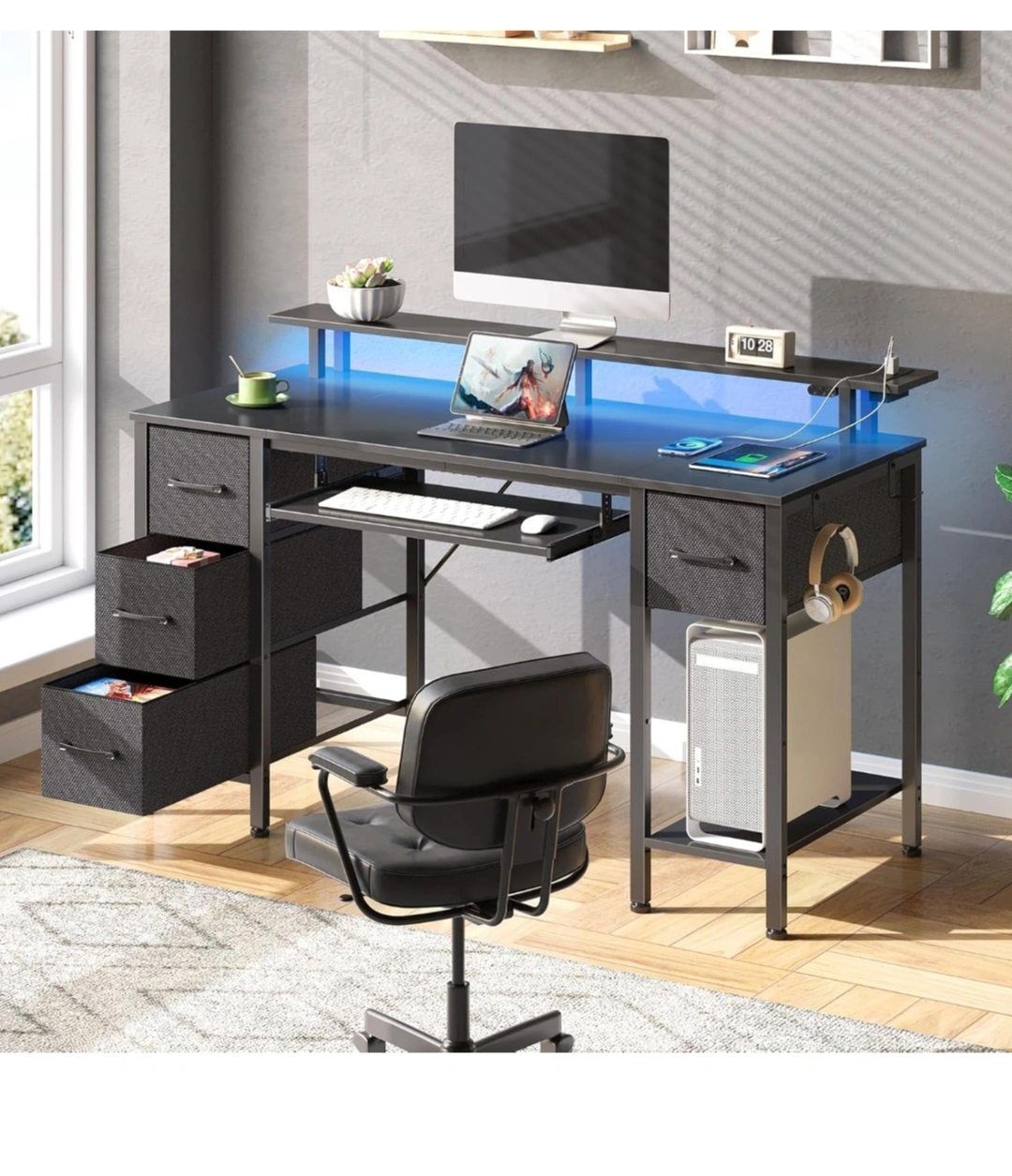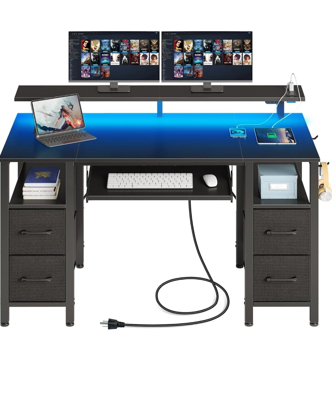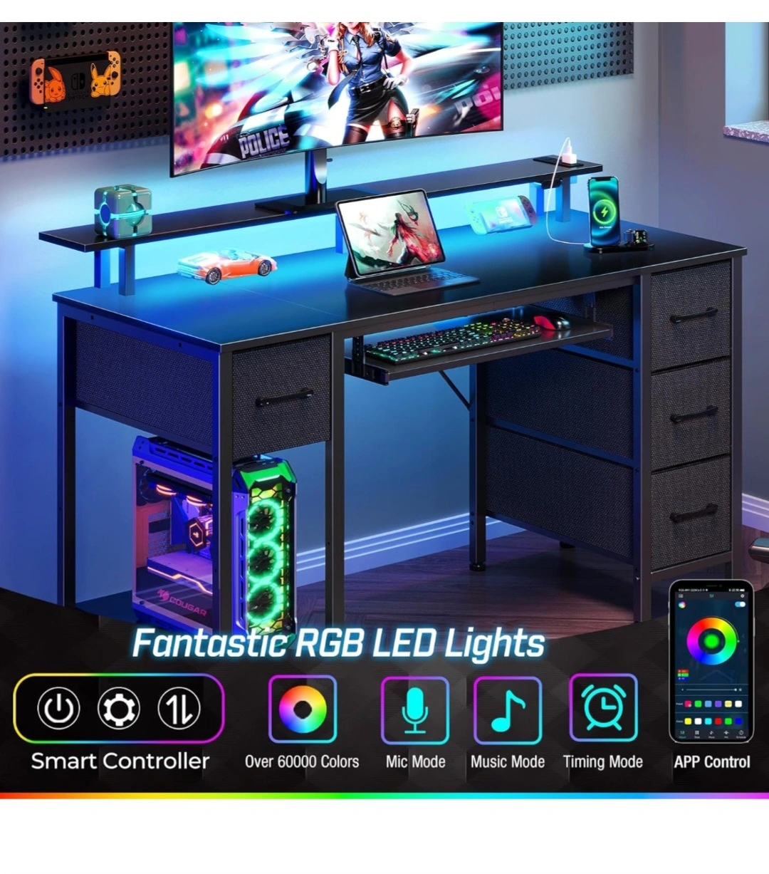 Computer Desk 47.2" with LED Lights & Power Outlets, Home Office Desk with 4 Drawers, Writing Desk with Keyboard Tray, Study Desk with Monitor Stand, Work Desk for Home Office, Black