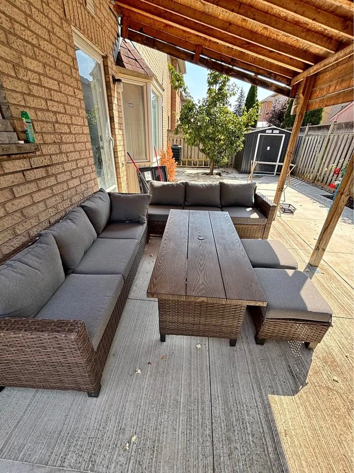 Ottomans store under table when not needed. Knock-down design makes storage a snap. Includes protective furniture covers. Use with a standard umbrella (sold separately). Shell: 50% Recycled polyester. Coordinates with other pieces in the Brookbury patio collection (sold separately). Complete 22 piece set includes (1) Left Arm 3 Seater, (1) Corner 3 Seater, 2 Ottomans, 1 Coffee Table, 7 Back Cushions, 8 Seat Cushions & 2 Patio Covers. Left Arm 3 Seater measures 74 in. W x 27.6 in. D x 29.3 in. H. Corner 3 Seater measures 78.3 in. W x 27.6 in. D x 29.3 in. H. Ottomans measure 18.1 in. W x 18.1 in. D x 12.9 in. H. Coffee Table measures 27 in. W x 53.5 in. D x 26.8 in. H. Overall product weight: 182.5 lbs