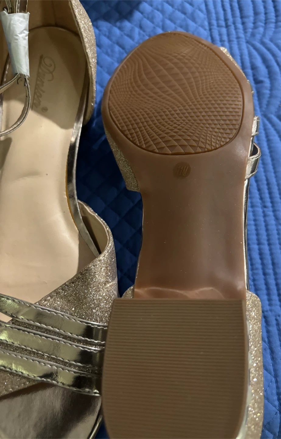 Dantion women's flat shoes in a shimmering gold glitter finish. Features delicate straps and a unique block heel embellished with faux pearls. Size 11M. Perfect for adding a touch of sparkle to any outfit!
