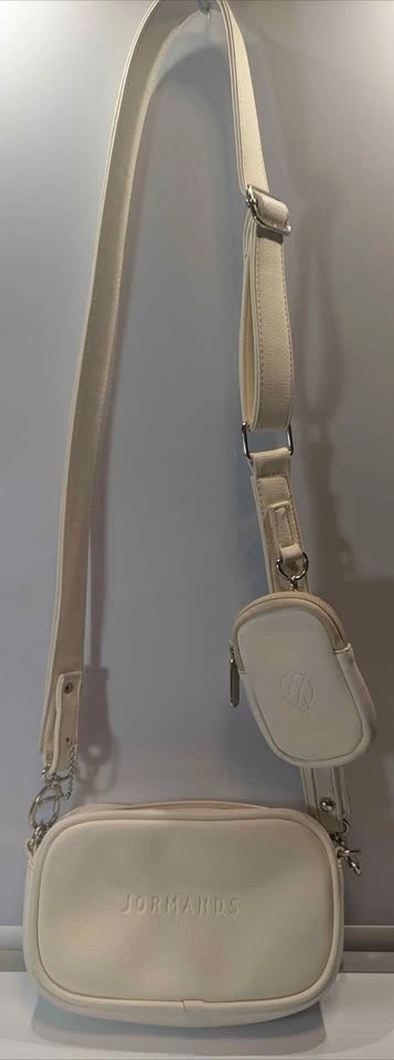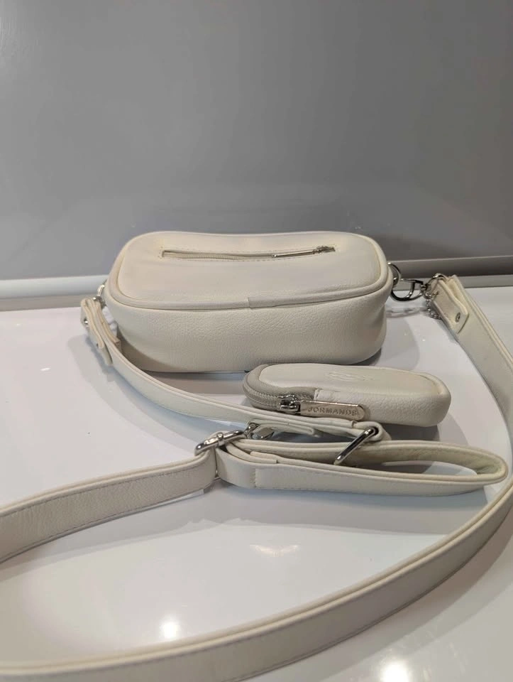 Elevate your streetwear game with this iconic Jormands Crossbody, a staple of modern Colombian design. Known for its distinct "utility" aesthetic and high-performance materials, this bag is the perfect blend of style and practicality for daily use or travel. Crafted from 100% Colombian PVC Vegan Leather—highly durable, waterproof, and effortless to clean. Features the classic "Bone" (off-white) colorway with embossed Jormands branding and custom metallic hardware. Includes the signature detachable circular coin purse on the adjustable strap, perfect for keys, AirPods, or small essentials. Fully lined with a waterproof interior to keep your belongings safe in any weather. Retails online for approximately $105.00 CAD. In "Fair to Good" pre-owned condition. This bag and attachable card holder and strap has some slight blueing on one side of the bag from rubbing against denim.