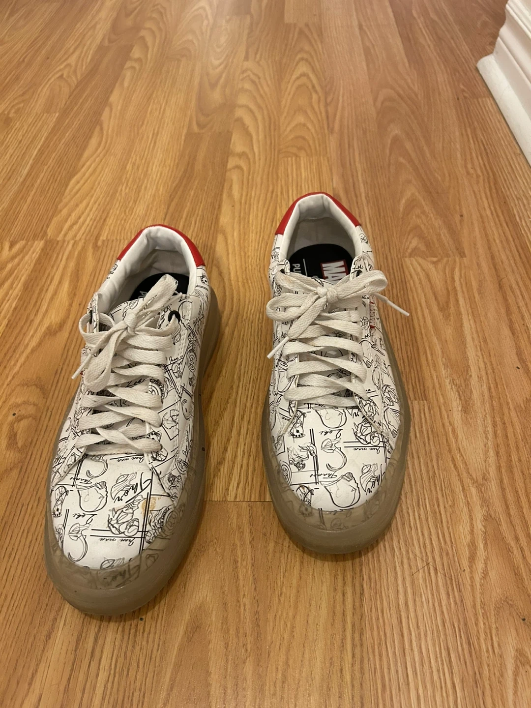Selling a pair of Pull&Bear Marvel sneakers in size 9. They feature a unique Marvel comic design on a white base with red accents. The soles are a light gum colour. They're in great shape and ready for a new home!