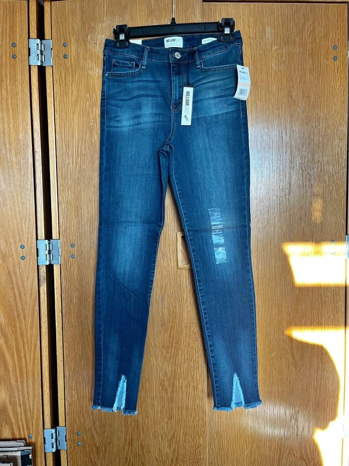 Dark blue skinny jeans with light whiskering and subtle distressing. Raw hem detail at the ankles. Stretch denim for a snug, comfortable fit. Versatile for casual outfits. Size 28.