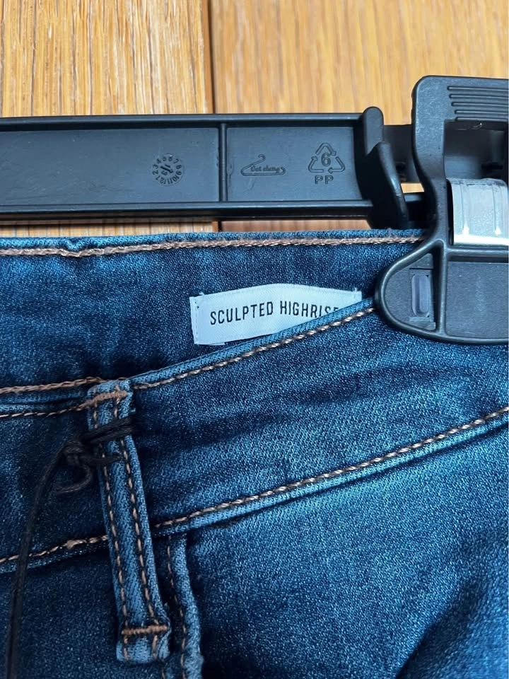 Dark blue skinny jeans with light whiskering and subtle distressing. Raw hem detail at the ankles. Stretch denim for a snug, comfortable fit. Versatile for casual outfits. Size 28.