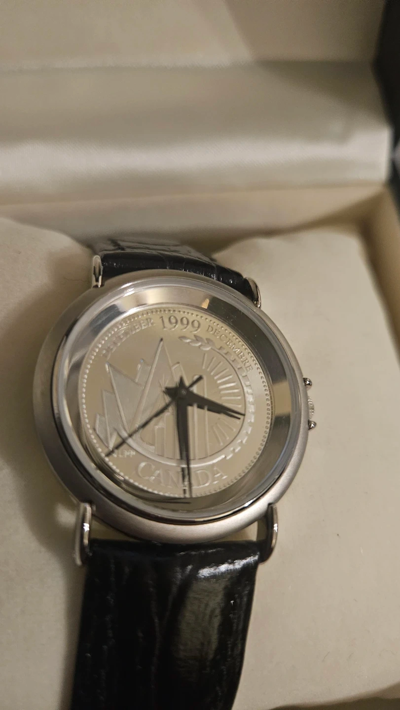Royal Canadian Mint collectible watch from December 1999. Features a coin design on the watch face. Includes original box. Leather strap.