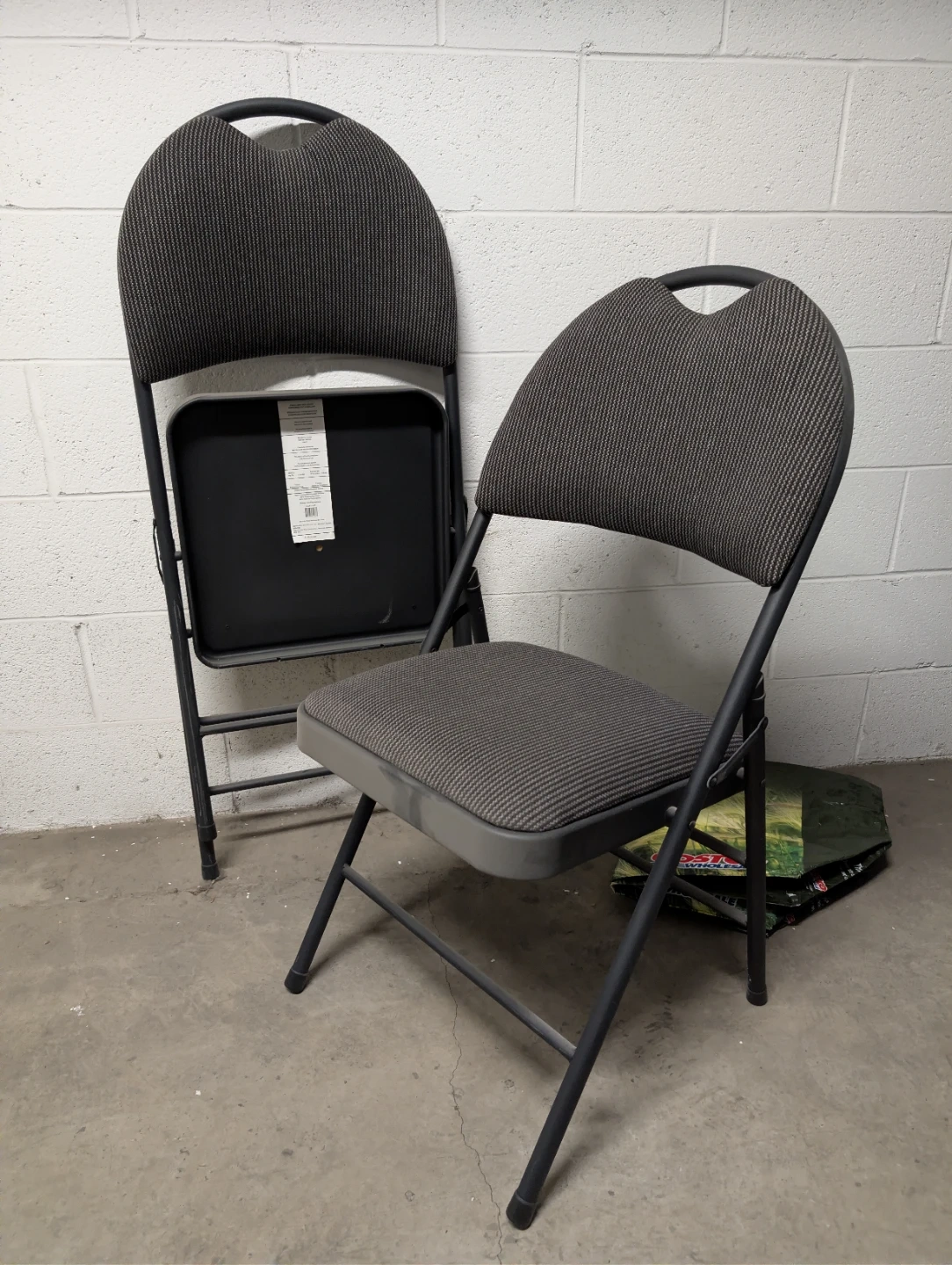 They feature a grey fabric seat and back with a black metal frame. These chairs are easy to fold and store. Great for extra seating at gatherings!