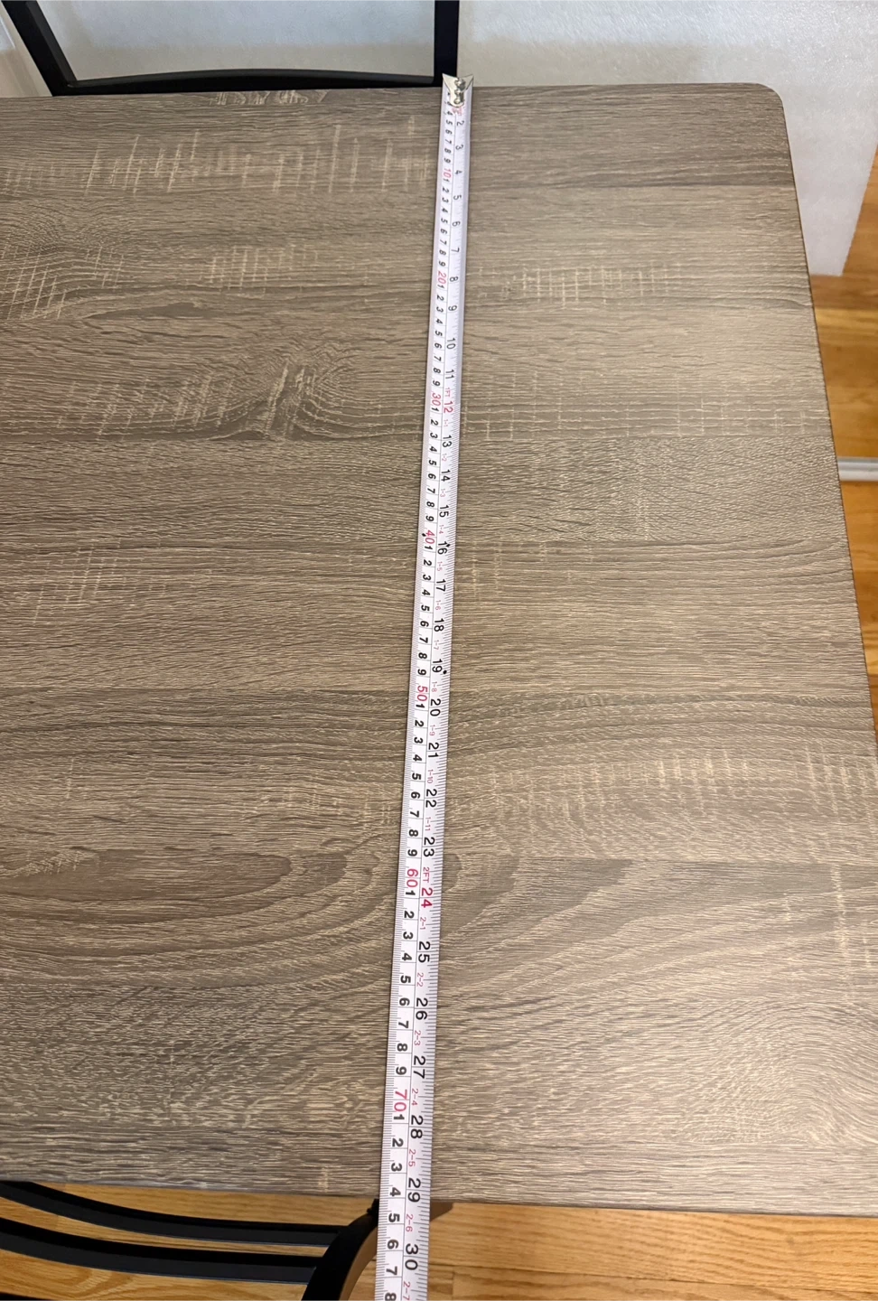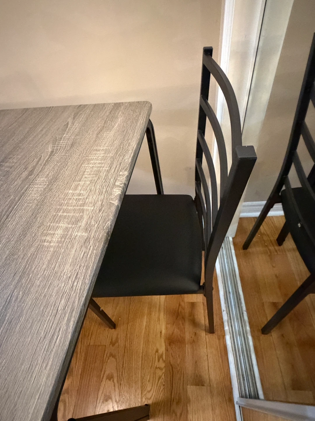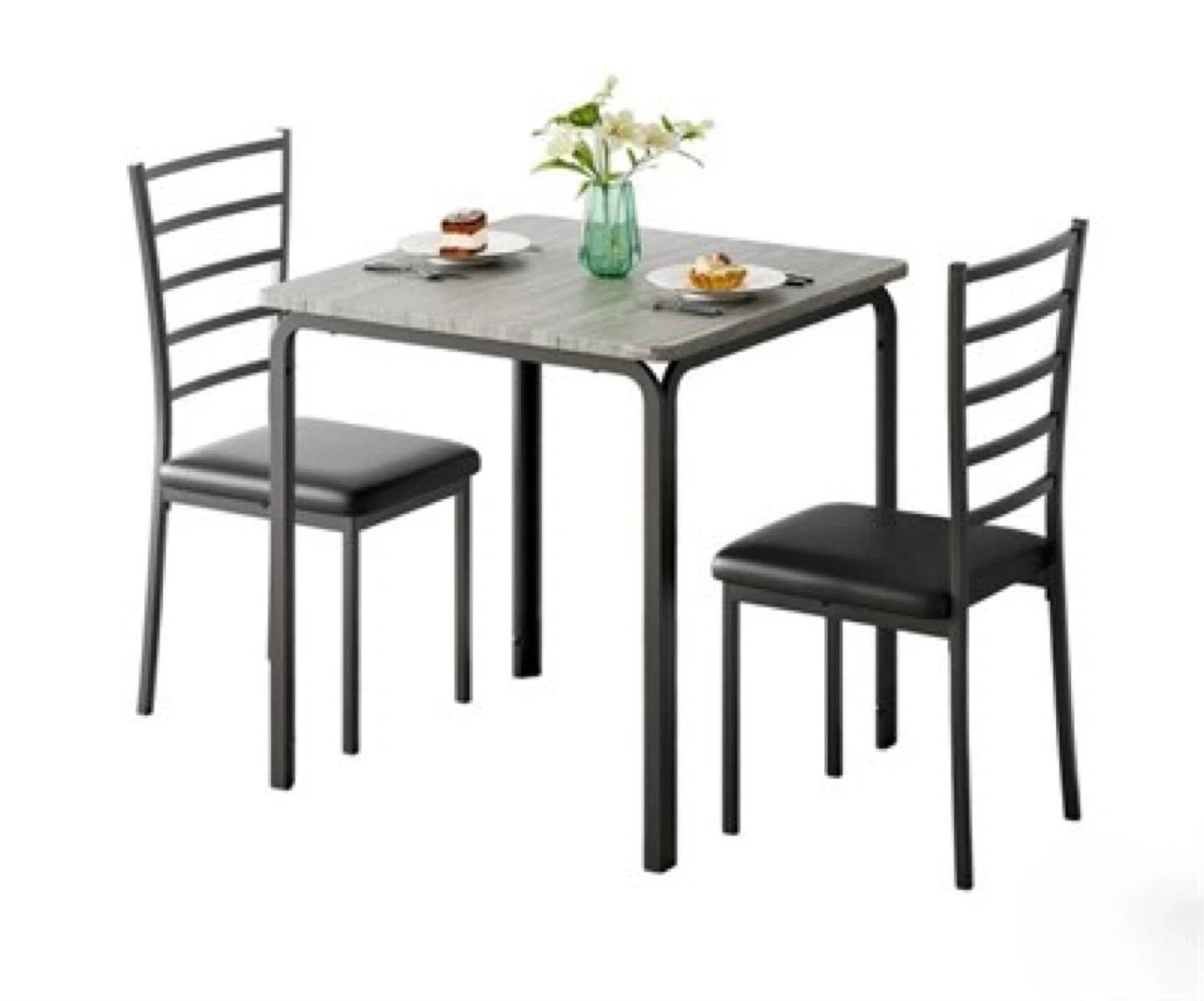 This is a 2-piece dining set featuring a square table with a wood-grain finish and two black chairs.