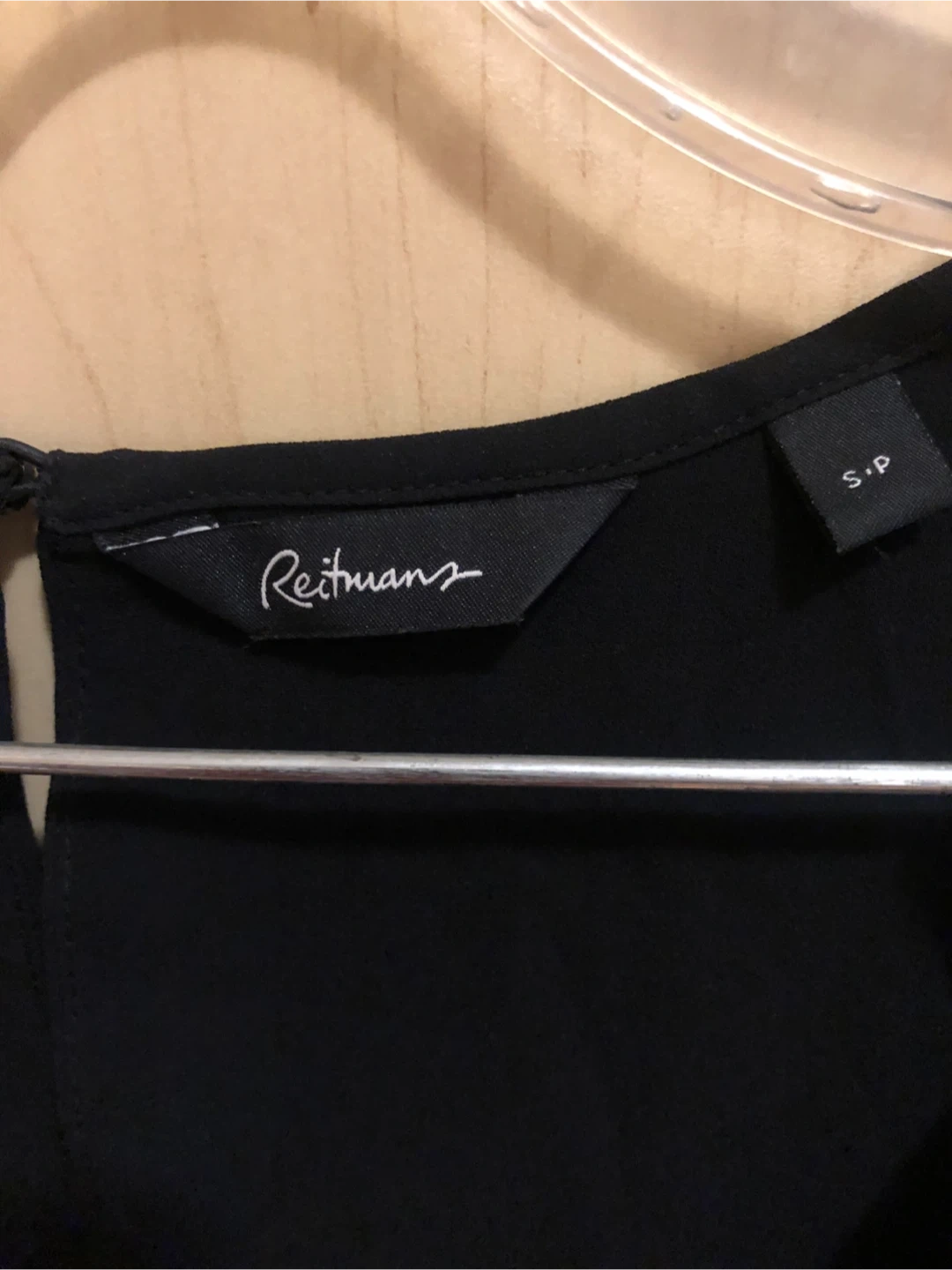 A simple black sleeveless dress by Reitmans. It features a cinched waist with a tie and a round neckline. Dress it up or down for various occasions!