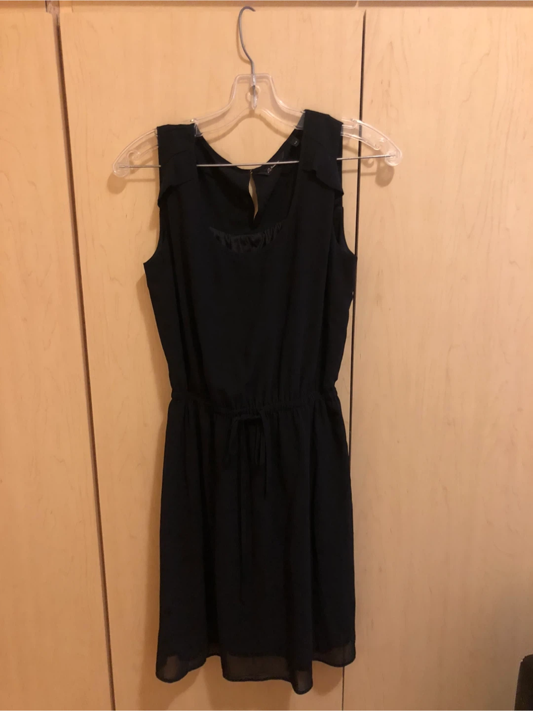 A simple black sleeveless dress by Reitmans. It features a cinched waist with a tie and a round neckline. Dress it up or down for various occasions!