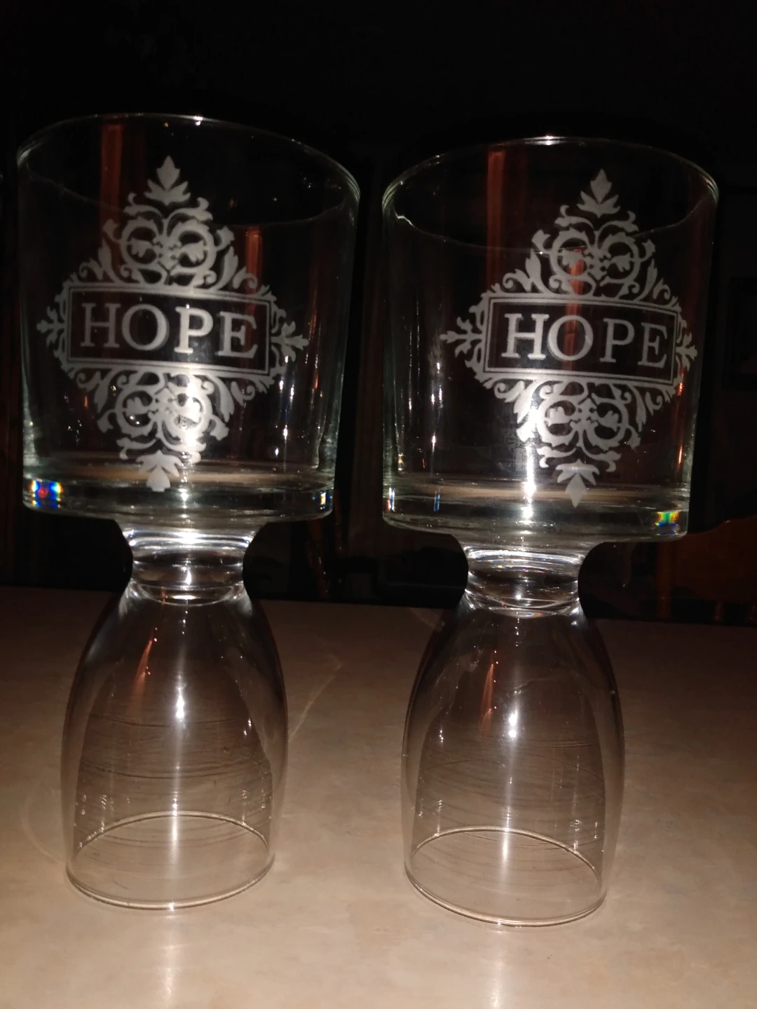 Two clear glass Candle holders featuring an etched "HOPE" design with decorative scrollwork. These glasses are sturdy and have a classic shape. Perfect for everyday use or special occasions!