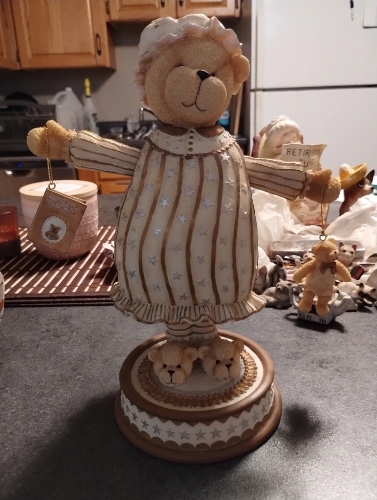 Collectible teddy bear figurine. Wearing pyjamas. Stands on a round base. Small bears on its feet. Comes with a small book charm. Music Box