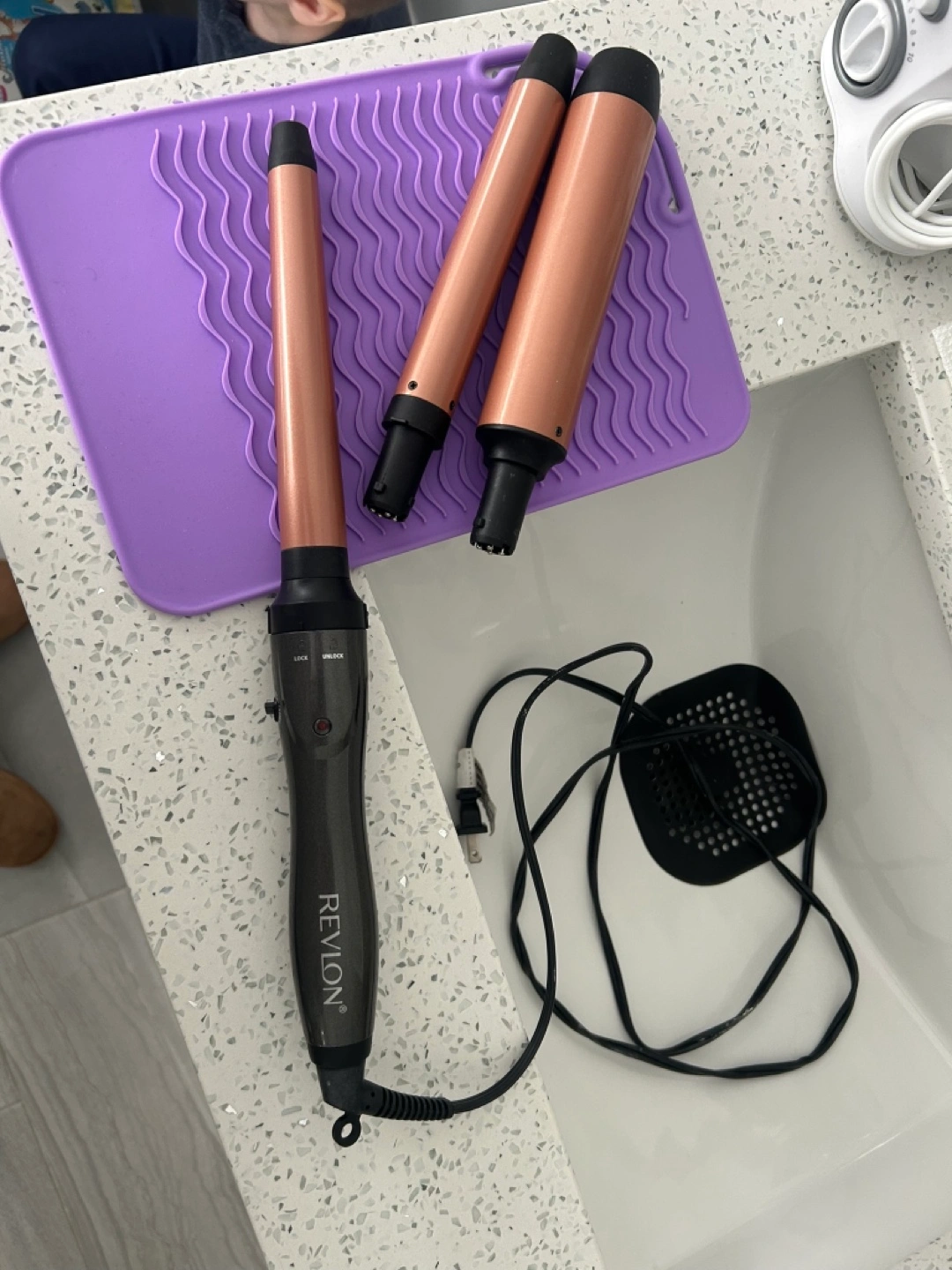 Three barrel curling iron, rose gold barrels, dark grey handle. Includes heat resistant mat and cord.
