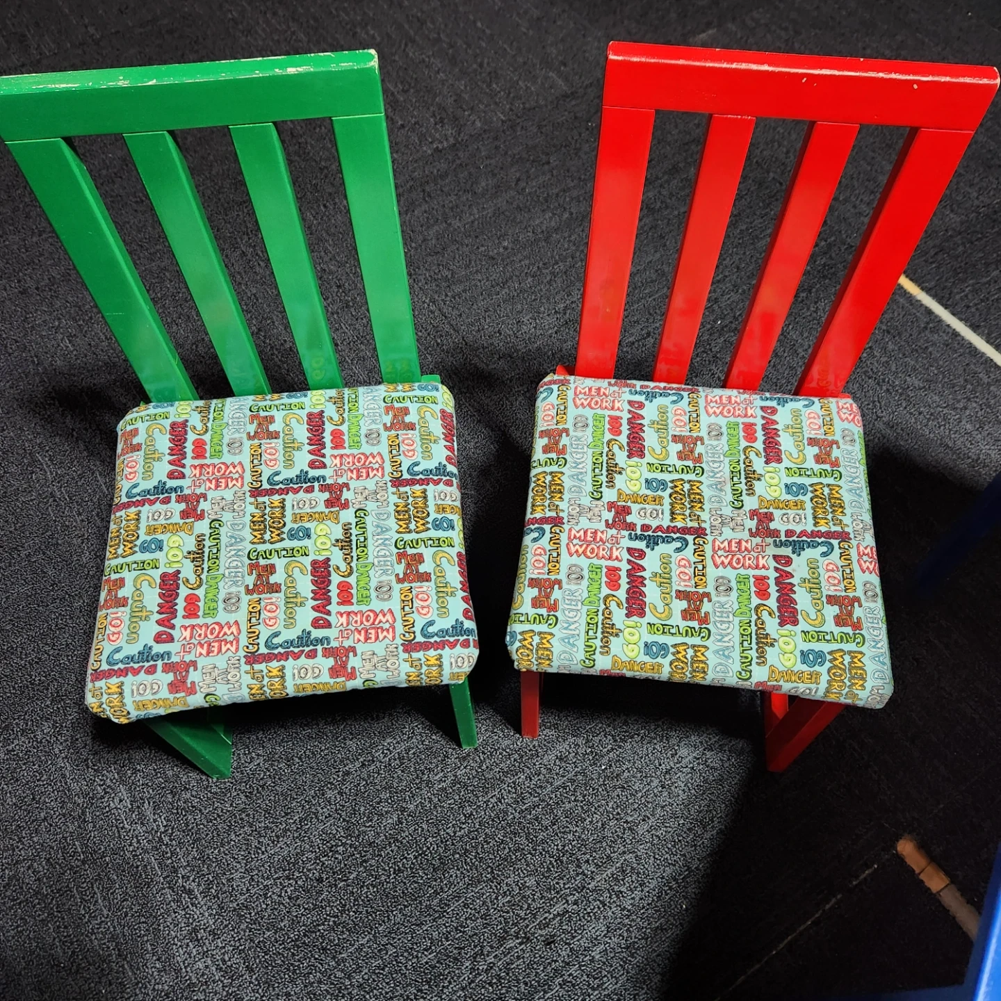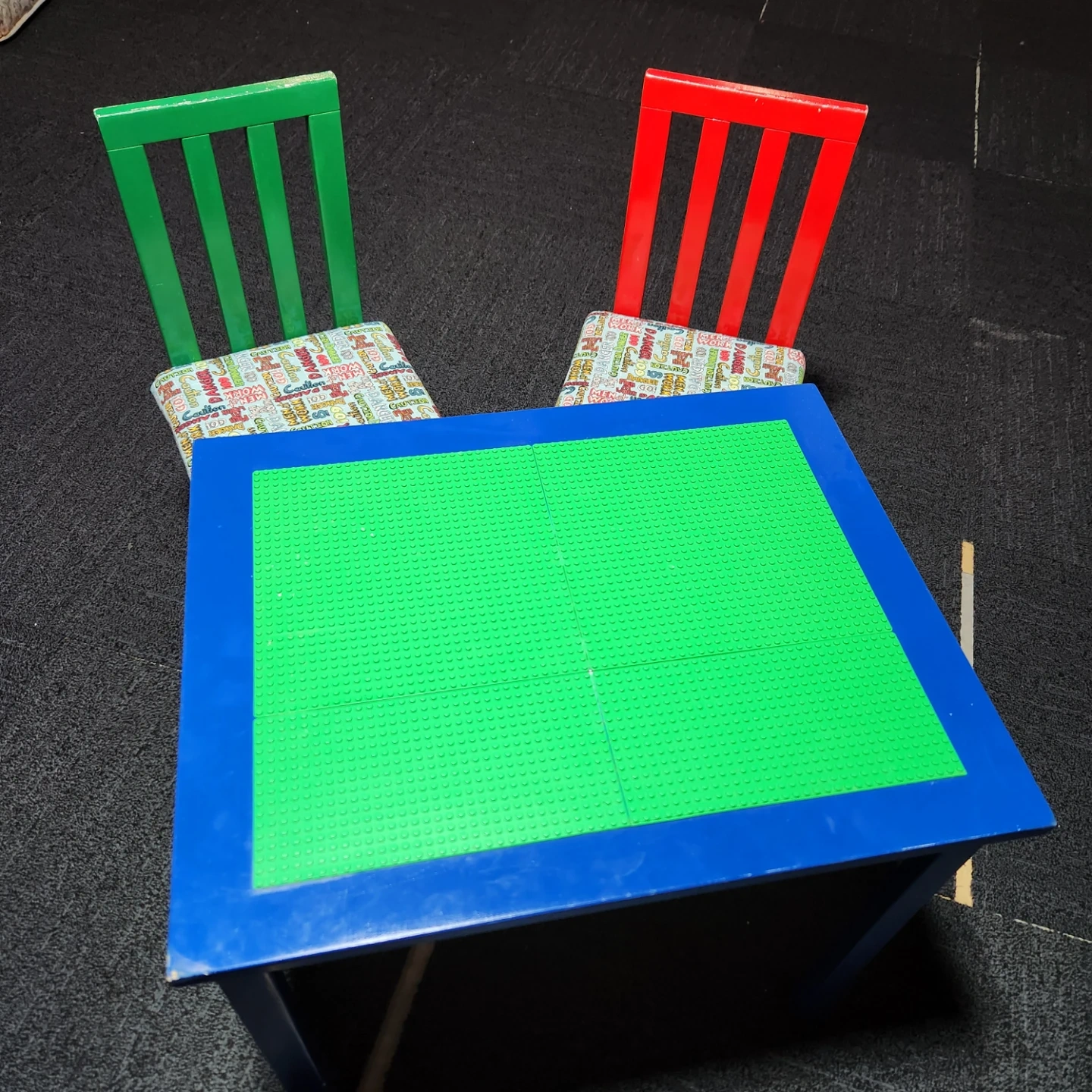 This set includes a blue LEGO activity table with a green building block base and two chairs, one red and one green. The chairs have colourful patterned seats featuring comic book style text.