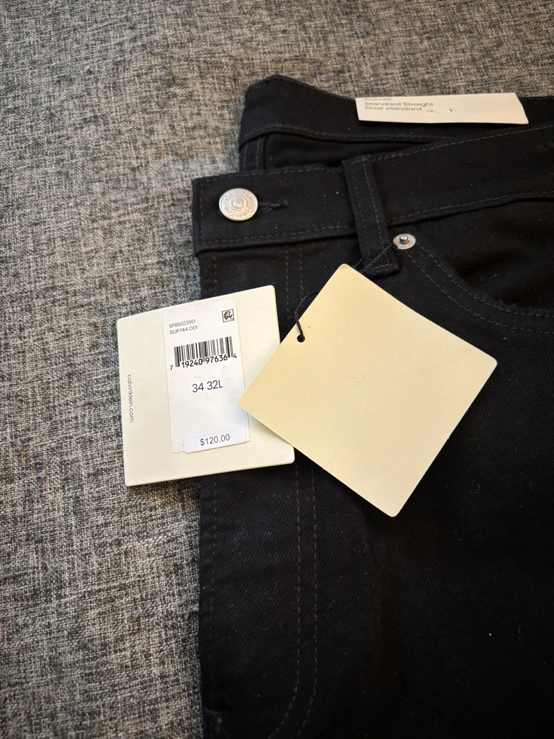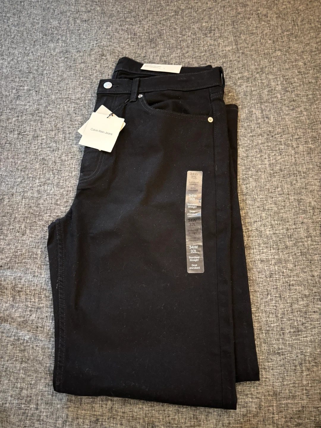 Brand new Calvin Klein jeans. Straight fit, black wash. Size 34 waist, 32 length. Original price $120.00.