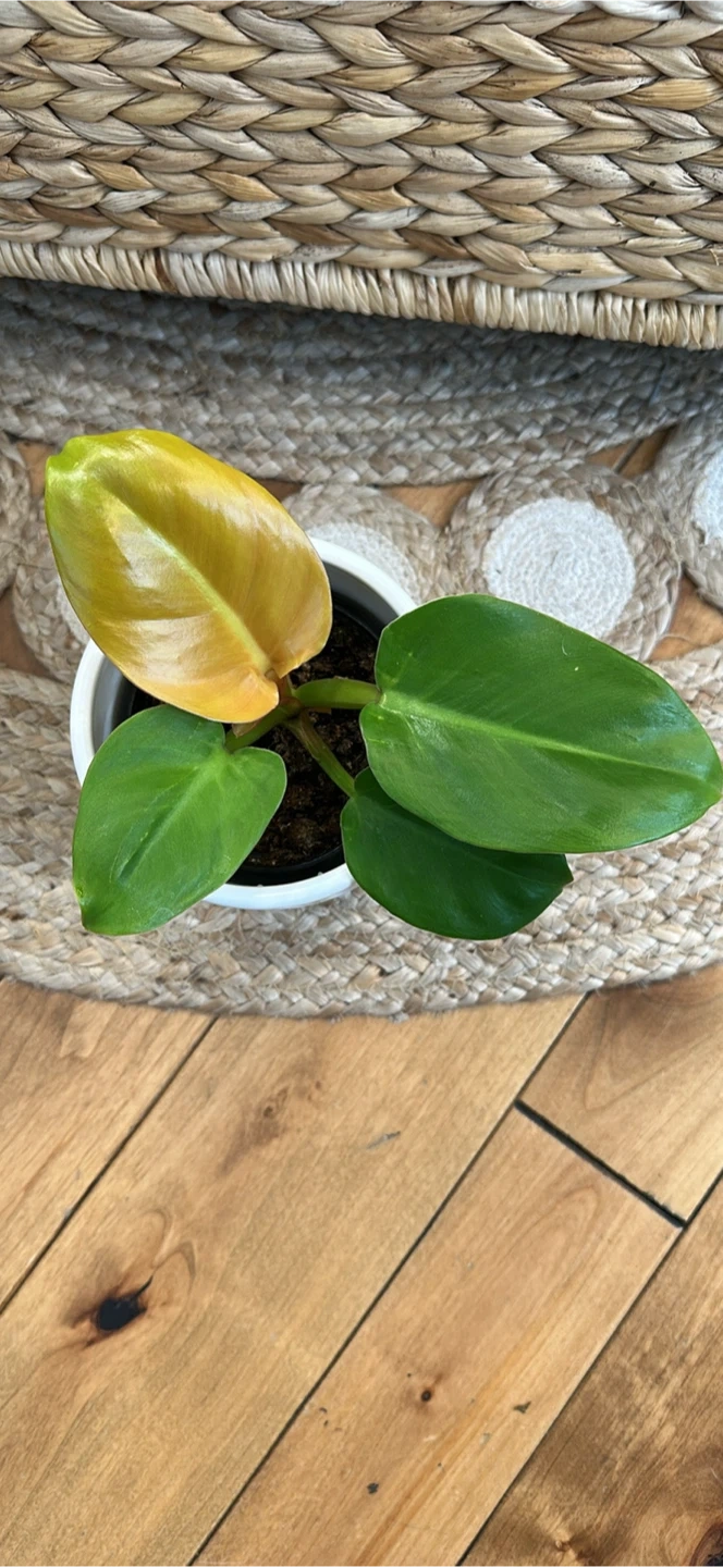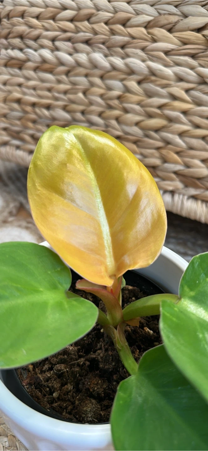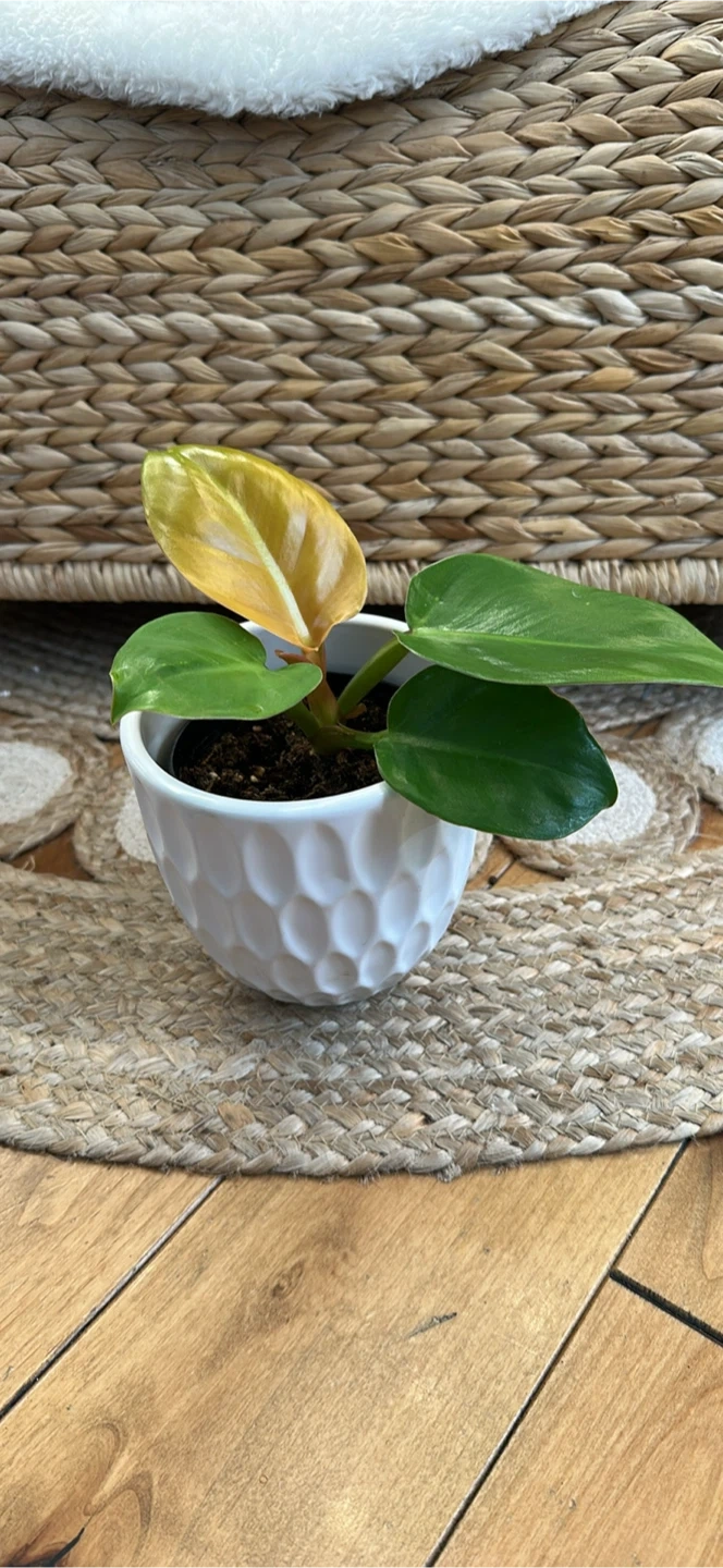 Uncommon Philodendron Melinonii Ghost in a white dimpled ceramic pot.