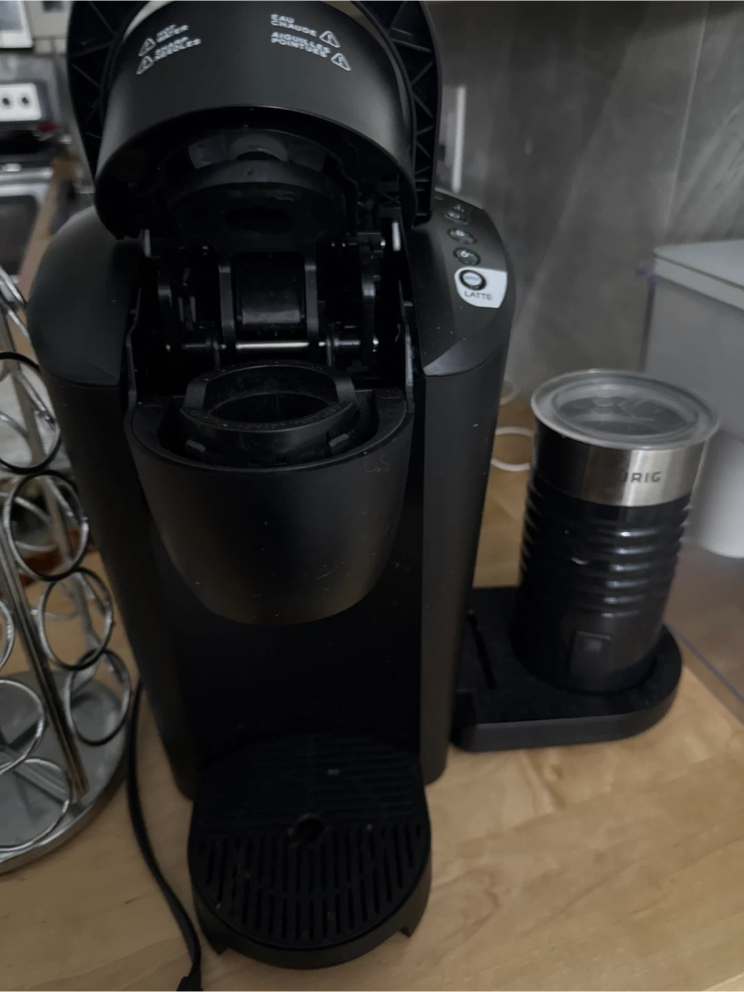 Black Keurig K-Mini coffee maker. Comes with a stainless steel K-Mini frother. This setup's great for making your favourite hot beverages at home. Perfect for a quick morning coffee or a frothy latte. Also has a k pod metal stand.