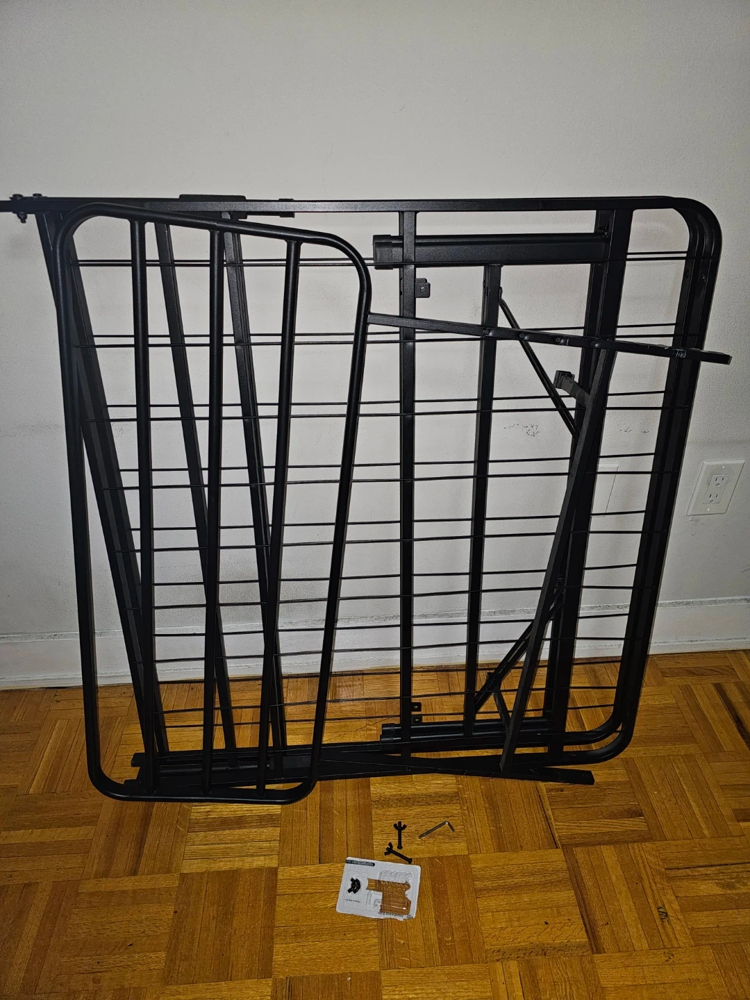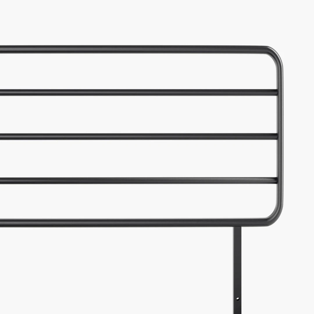 Sturdy black metal bed frame with a simple headboard. Includes all hardware for assembly. This frame offers reliable mattress support for a good night's sleep. It's ideal for a guest room or smaller living space. .