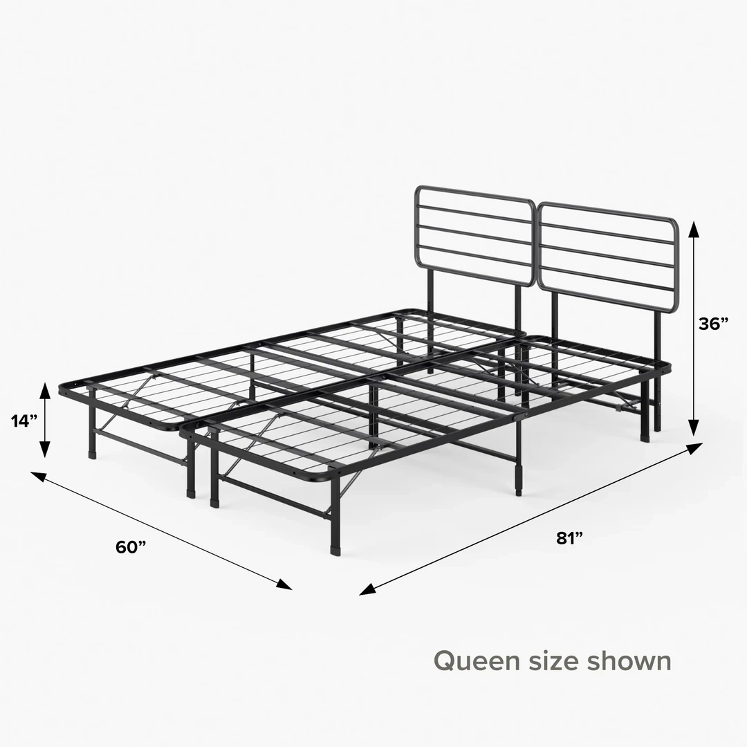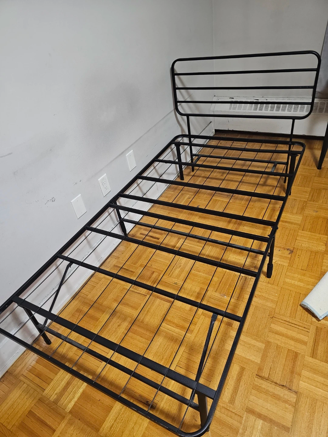 Sturdy black metal bed frame with a simple headboard. Includes all hardware for assembly. This frame offers reliable mattress support for a good night's sleep. It's ideal for a guest room or smaller living space. .