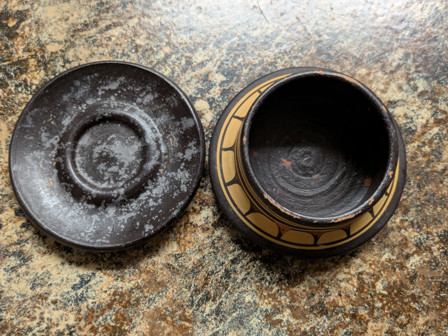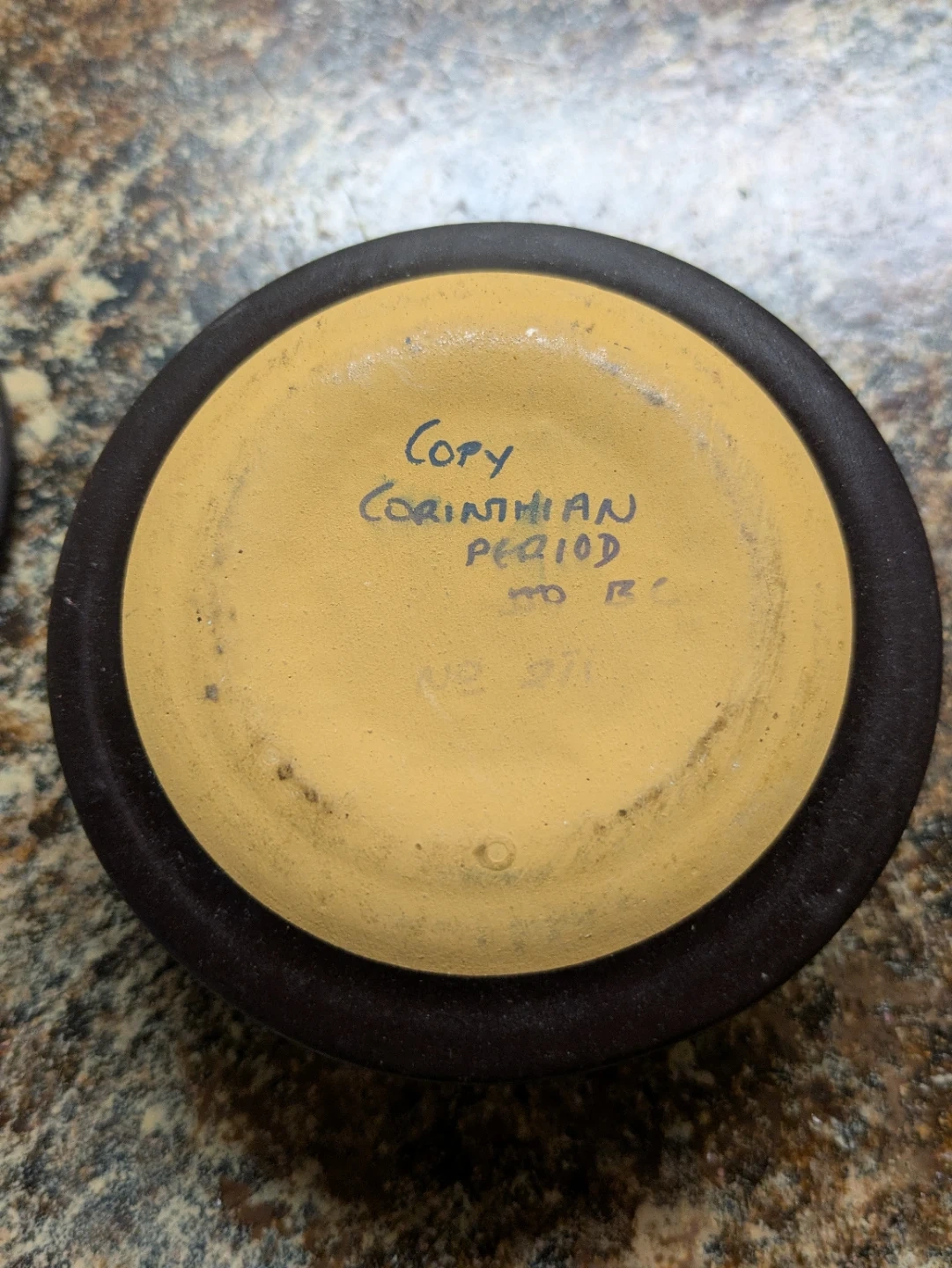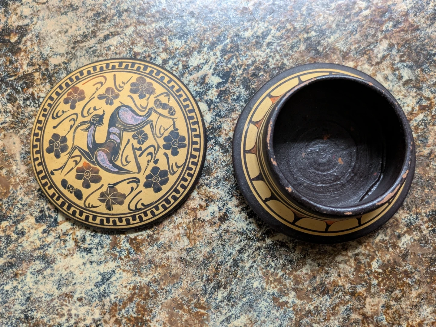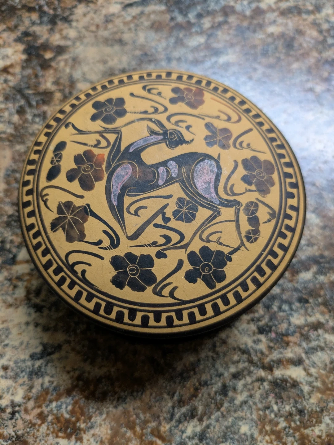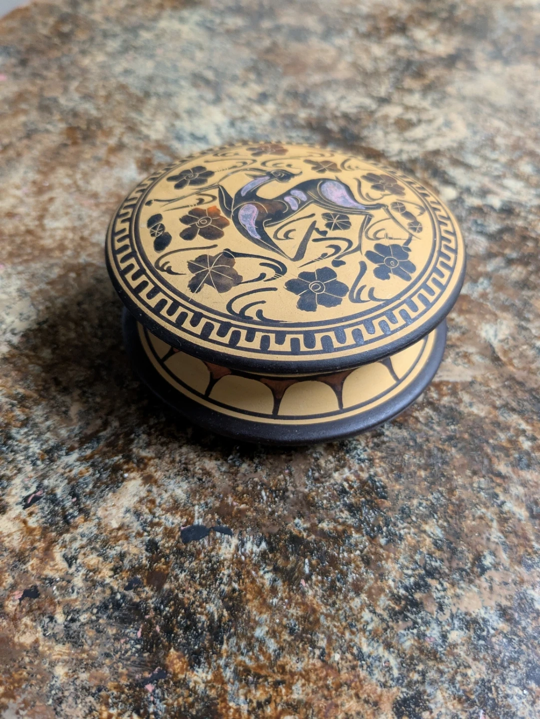 This vintage decorative box features a design inspired by the Corinthian period. It's a lidded container with intricate patterns. This piece could be used for storing small items or as a display accent. Measures 2.5" x 1.5" inches.