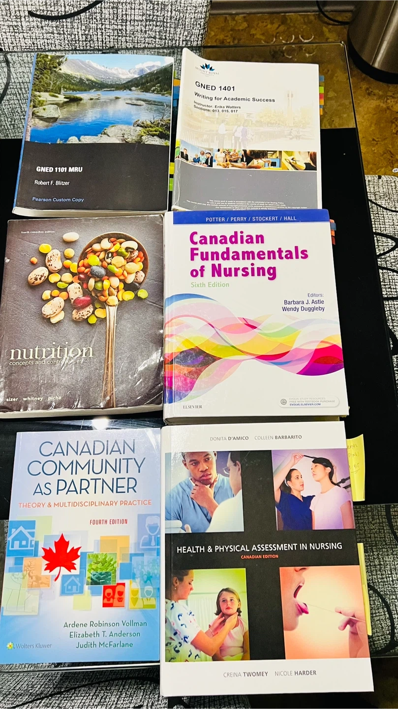 Bundle of six textbooks for nursing and general education programs. Includes 'Canadian Fundamentals of Nursing,' 'Health & Physical Assessment in Nursing,' 'Canadian Community as Partner,' 'Nutrition: Concepts and Controversies,' 'GNED 1101 MRU,' and 'GNED 1401 Writing for Academic Success.' These books cover a range of essential topics for post-secondary studies.