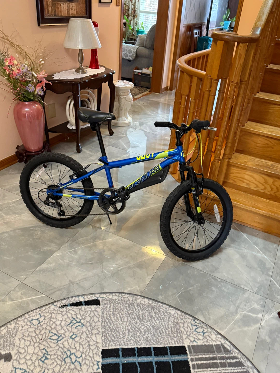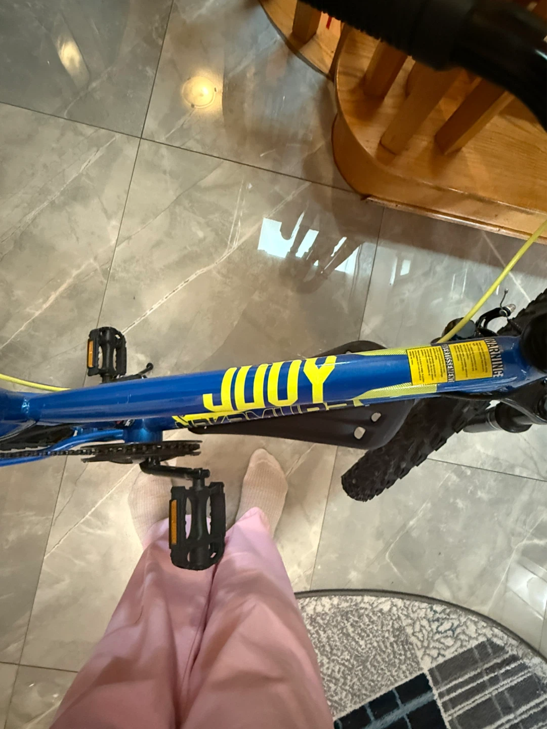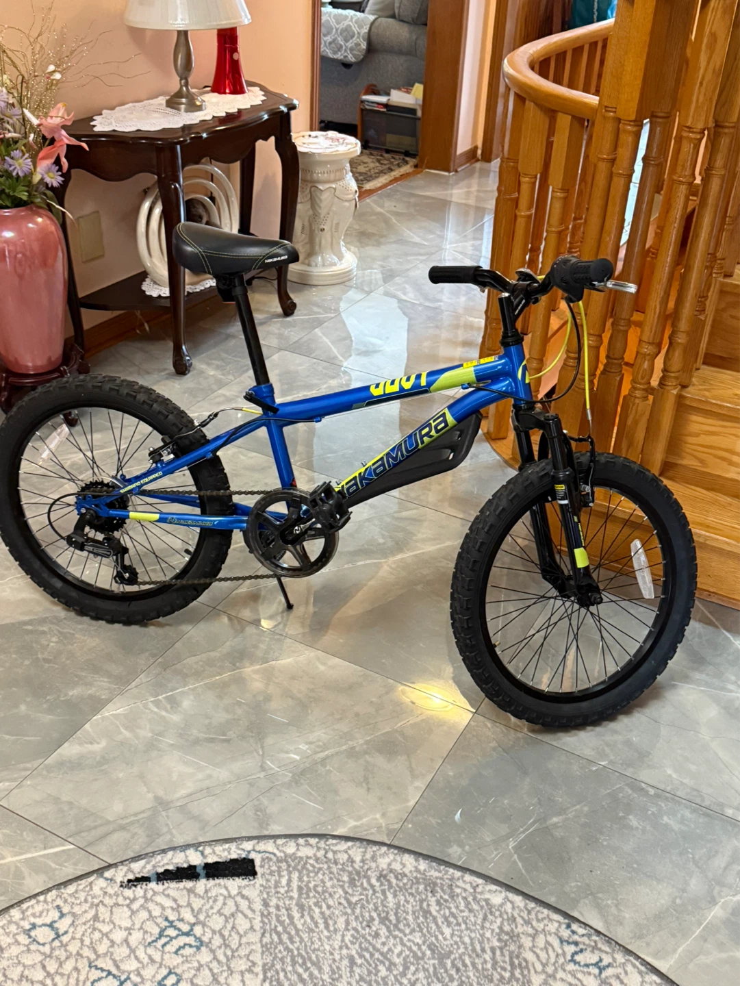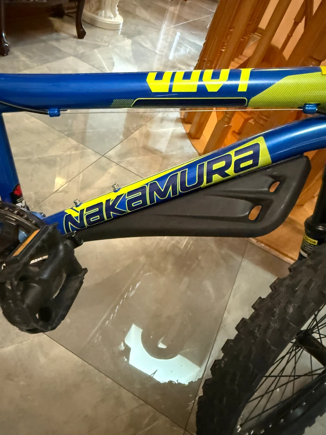 Blue Nakamura kids bike with "JUUI" graphics. Shimano equipped with 21 speeds. Perfect for young riders looking for a fun ride! 22 inches.
