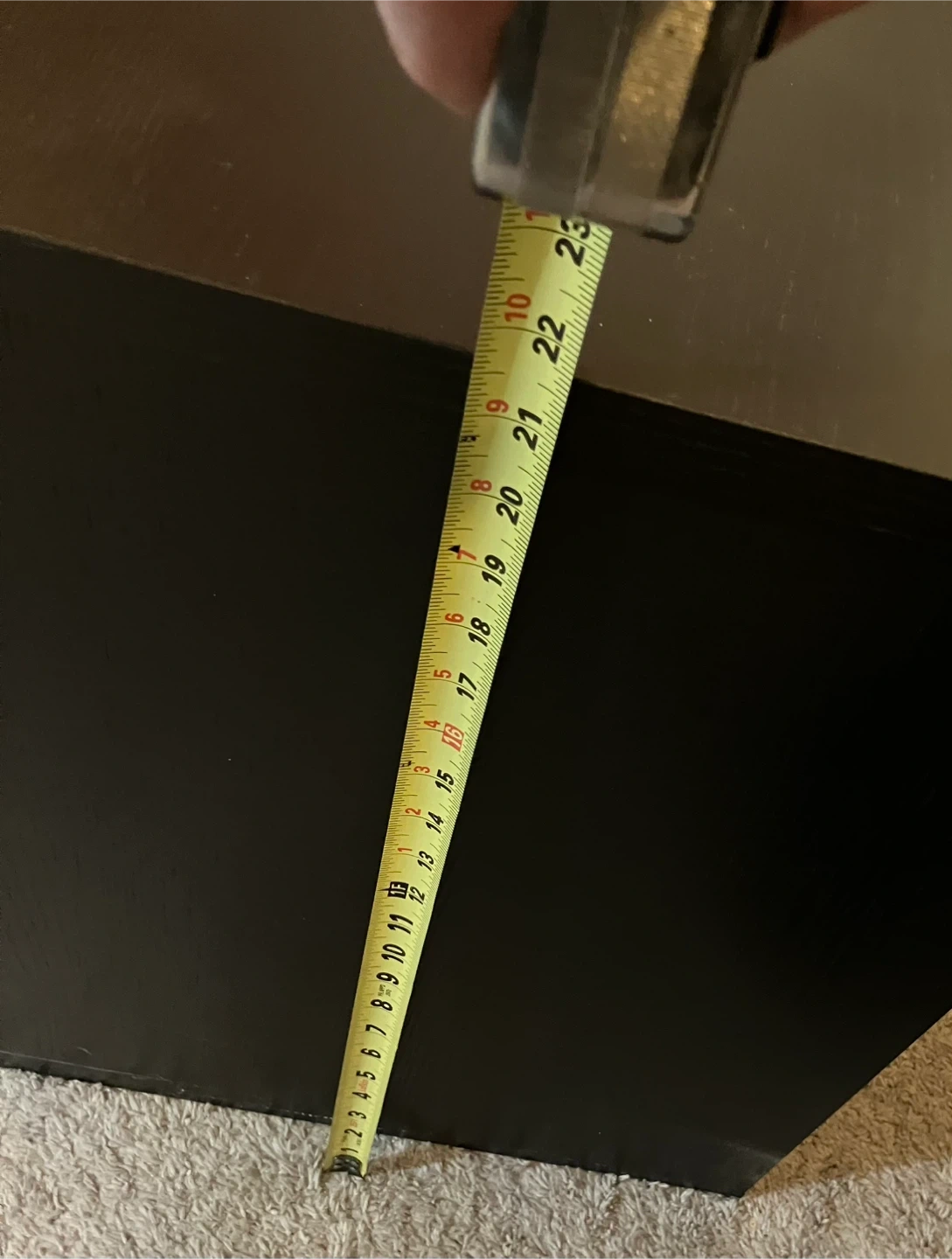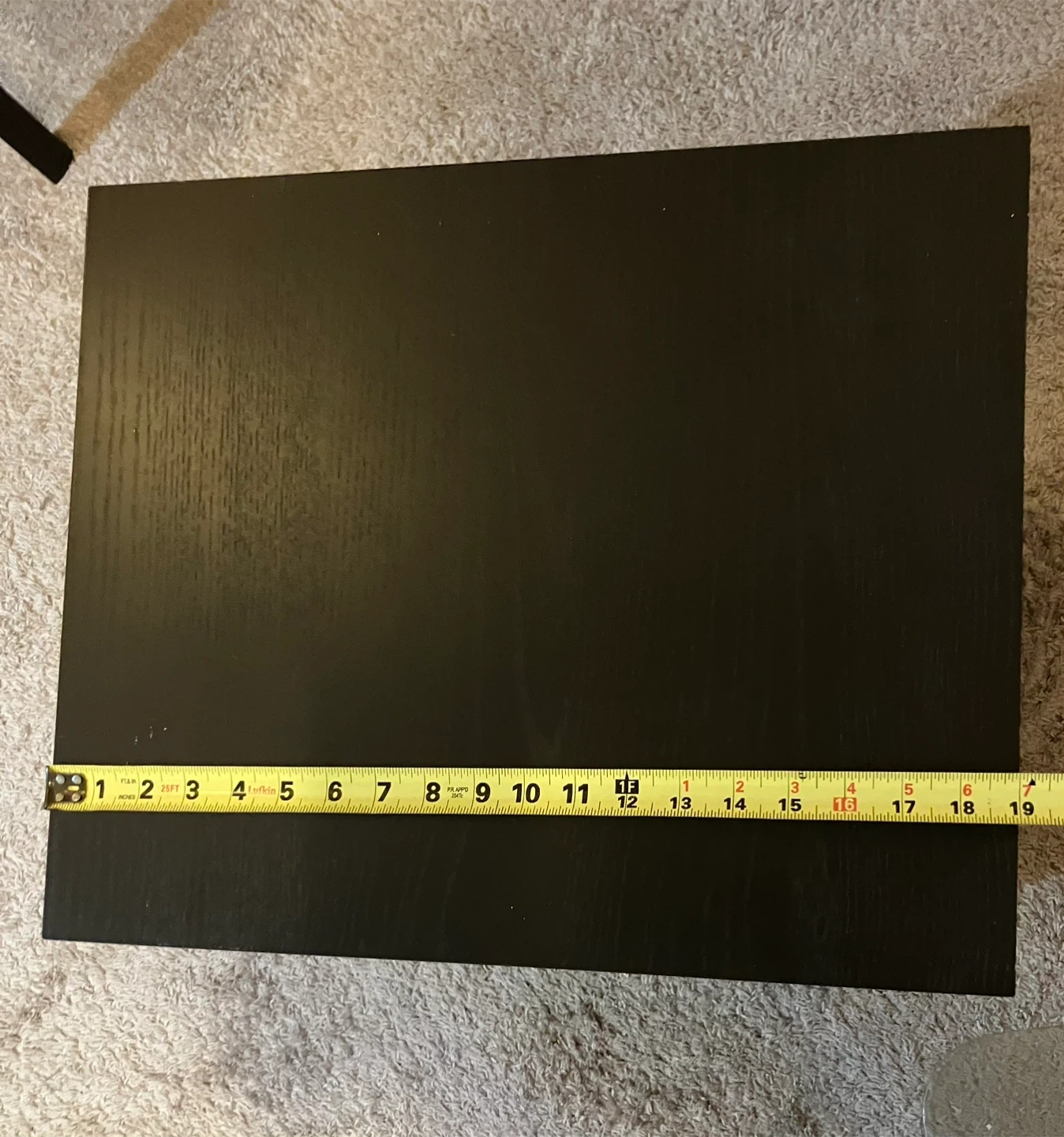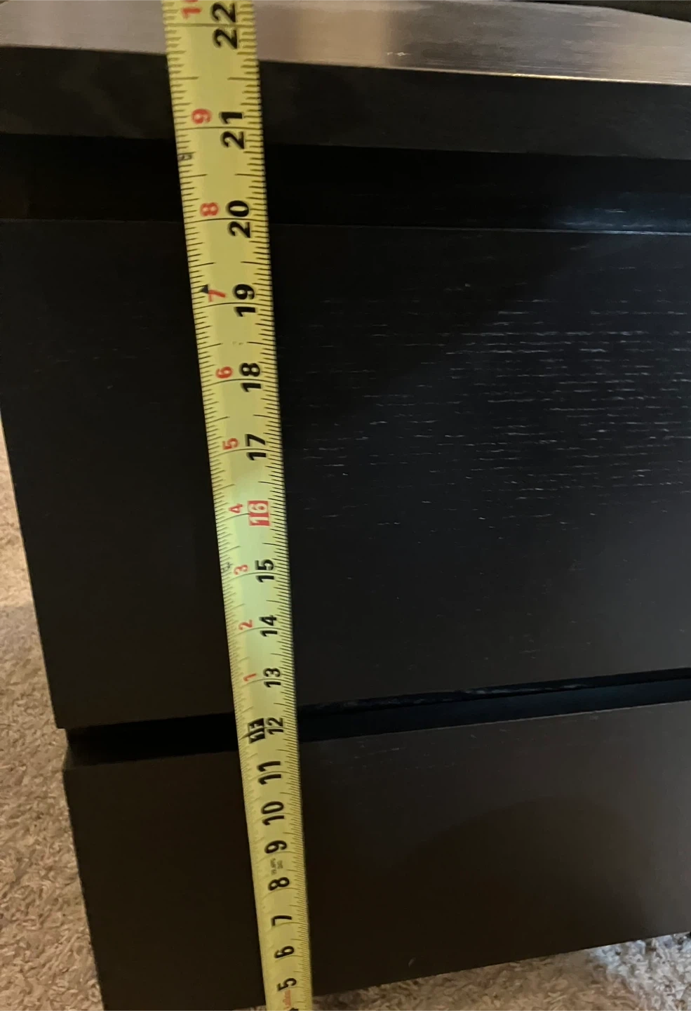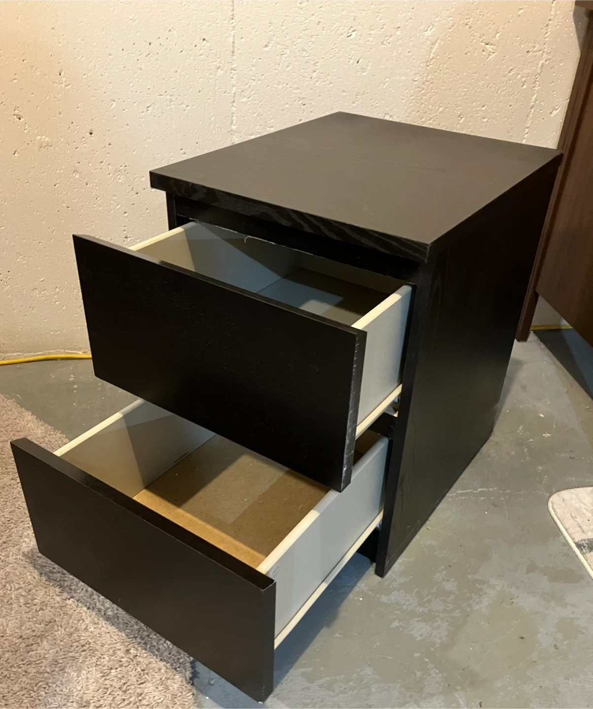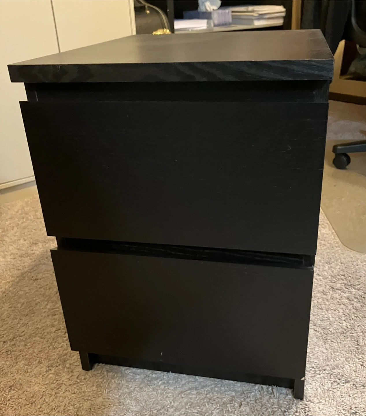 Black two-drawer side table. Dimensions are approximately 18 inches wide, 20 inches deep, and 22 inches tall. Drawers slide smoothly. Originally from IKEA.