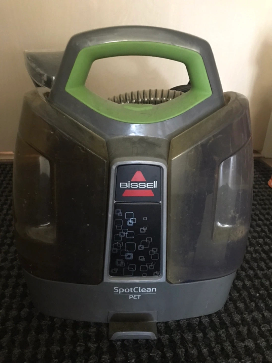 Used Bissell SpotClean Pet portable carpet cleaner. Includes hose and cleaning tool.