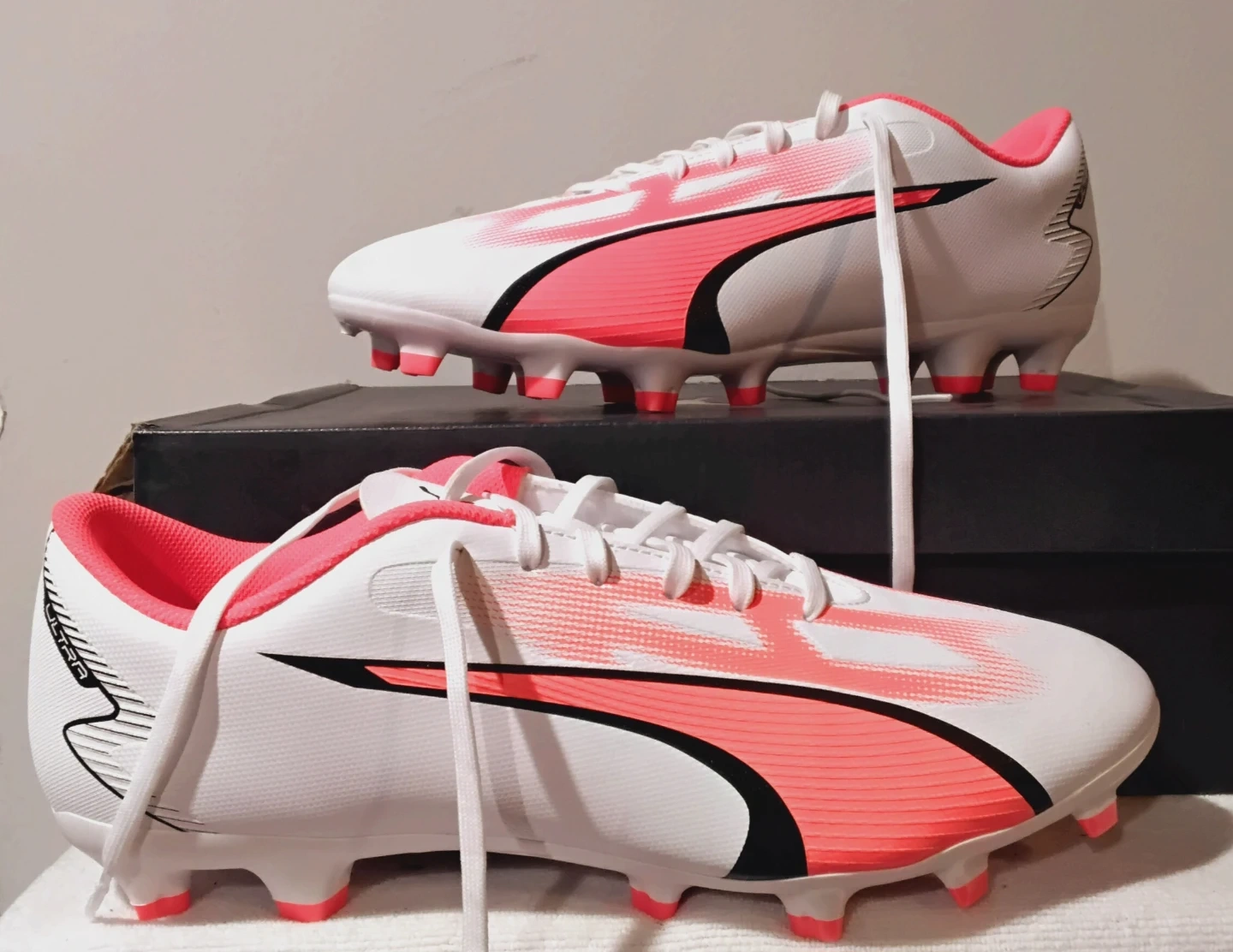 These Puma soccer cleats are white with pink accents. They come with laces and are ready for the field. Synthetic upper material for durability. Suitable for playing soccer on firm ground.Size:10.5