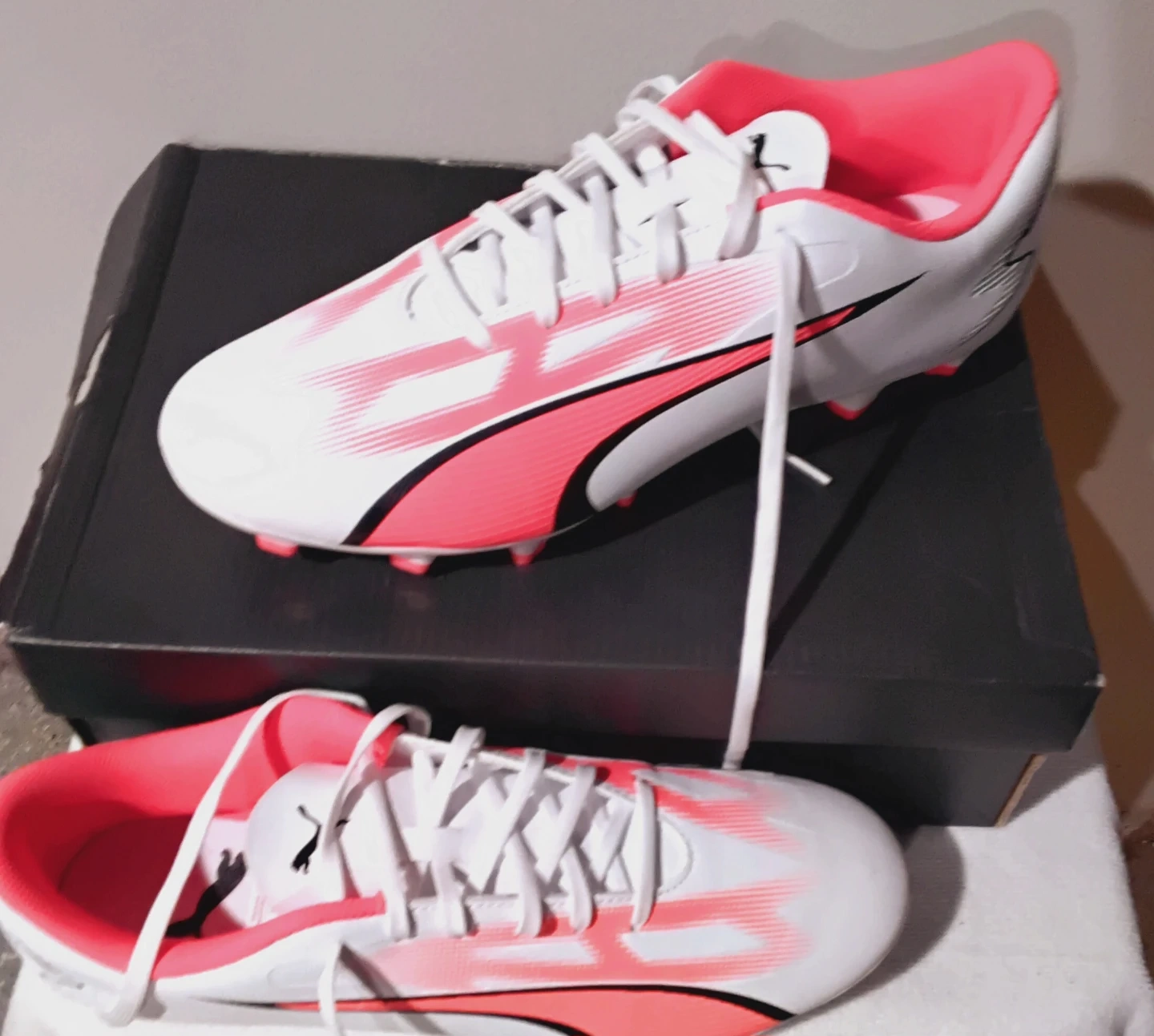 These Puma soccer cleats are white with pink accents. They come with laces and are ready for the field. Synthetic upper material for durability. Suitable for playing soccer on firm ground.Size:10.5