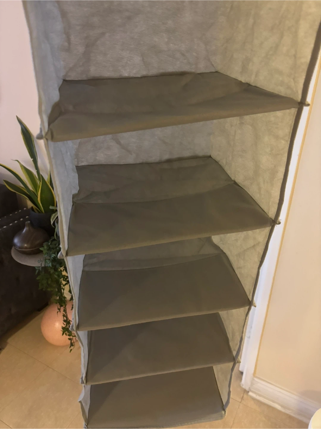 Declutter your closet with this handy hanging organizer.It's perfect for storing clothes, shoes, or accessories. The neutral grey colour will fit seamlessly into any closet. It's in great condition and ready to help you maximize your space.