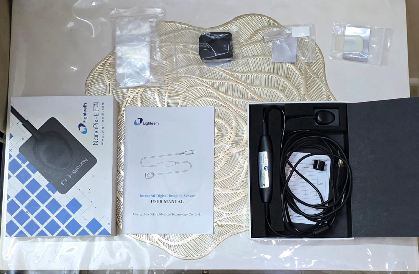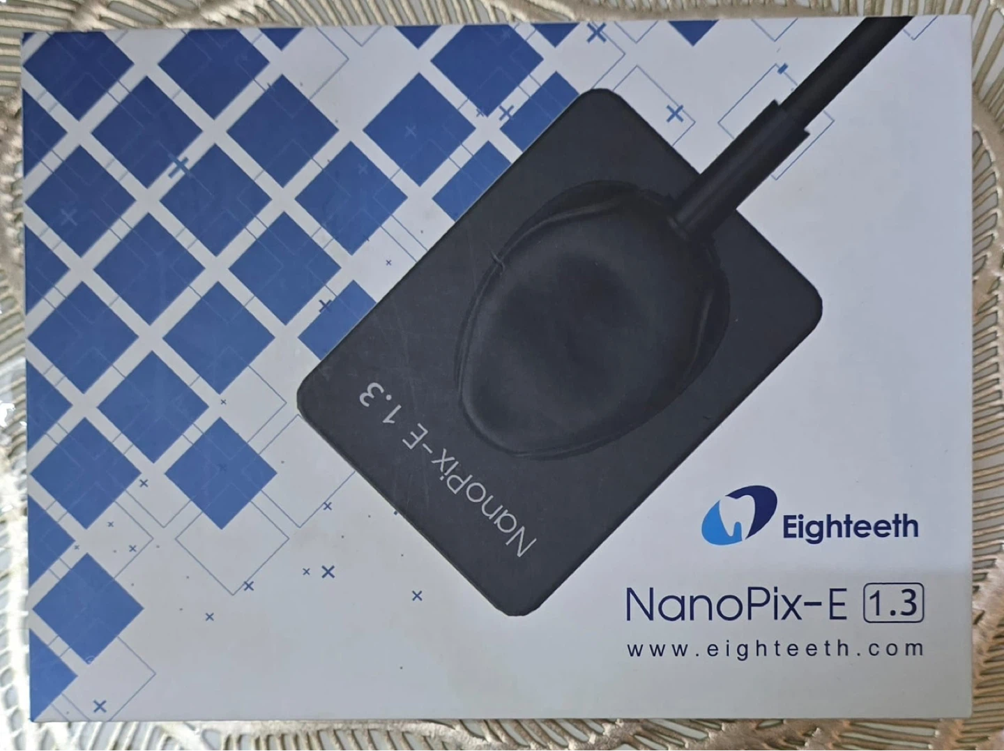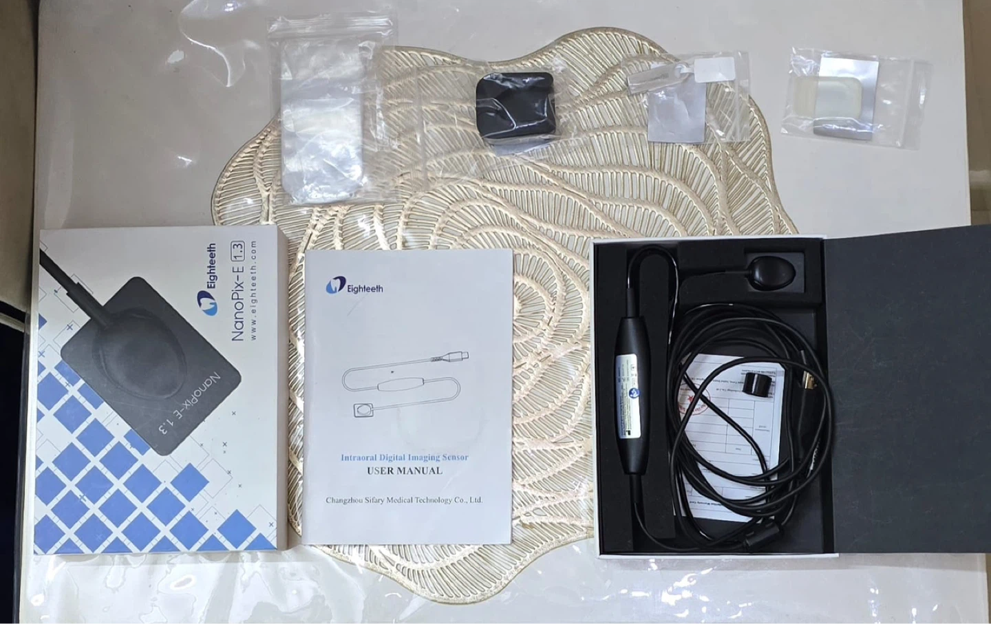 This is the Eighteeth NanoPix-E 1.3 intraoral digital imaging sensor. It comes with the original box, user manual, and all accessories shown in the photos. It's designed for dental imaging.