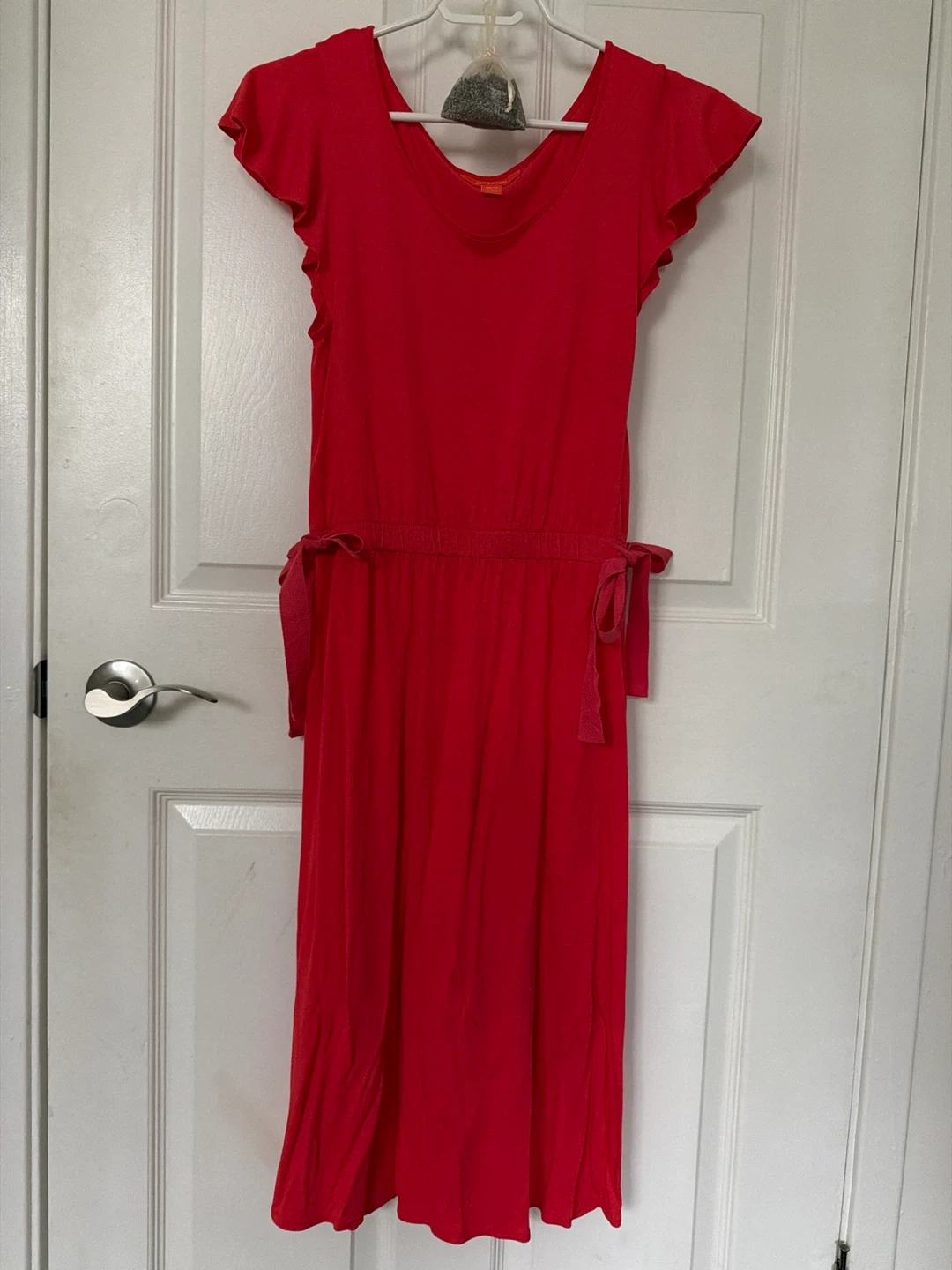 A comfortable red dress with flutter sleeves and a drawstring waist. It's made of a soft, breathable fabric, perfect for casual wear. This dress is a size small.
