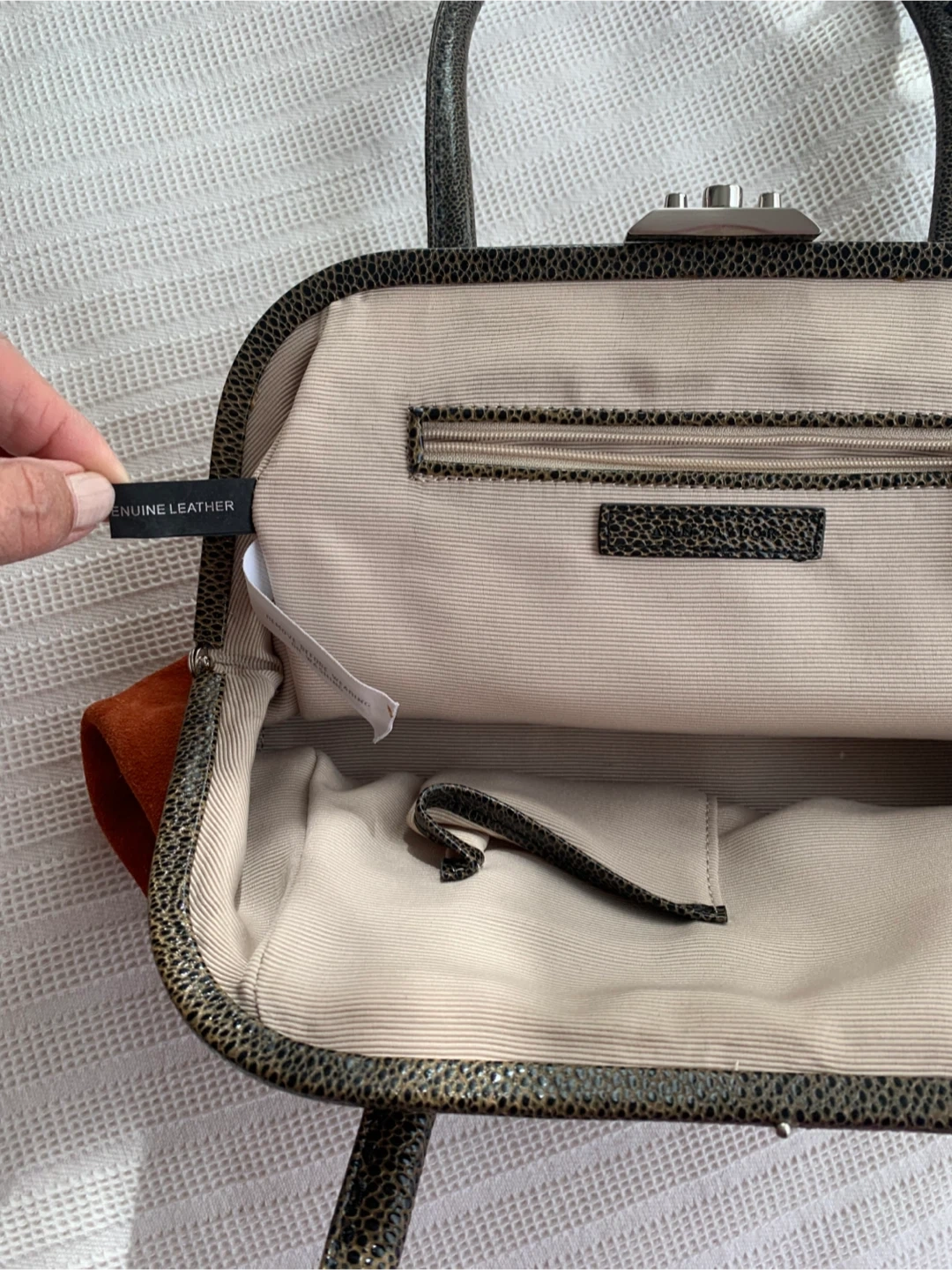 This is a lovely Ann Taylor handbag made of orange suede and leather. It's in great condition and ready for a new home! The interior is lined with a neutral fabric and features a zippered pocket. Perfect for adding a pop of colour to your outfit