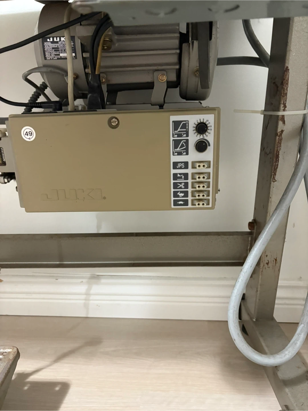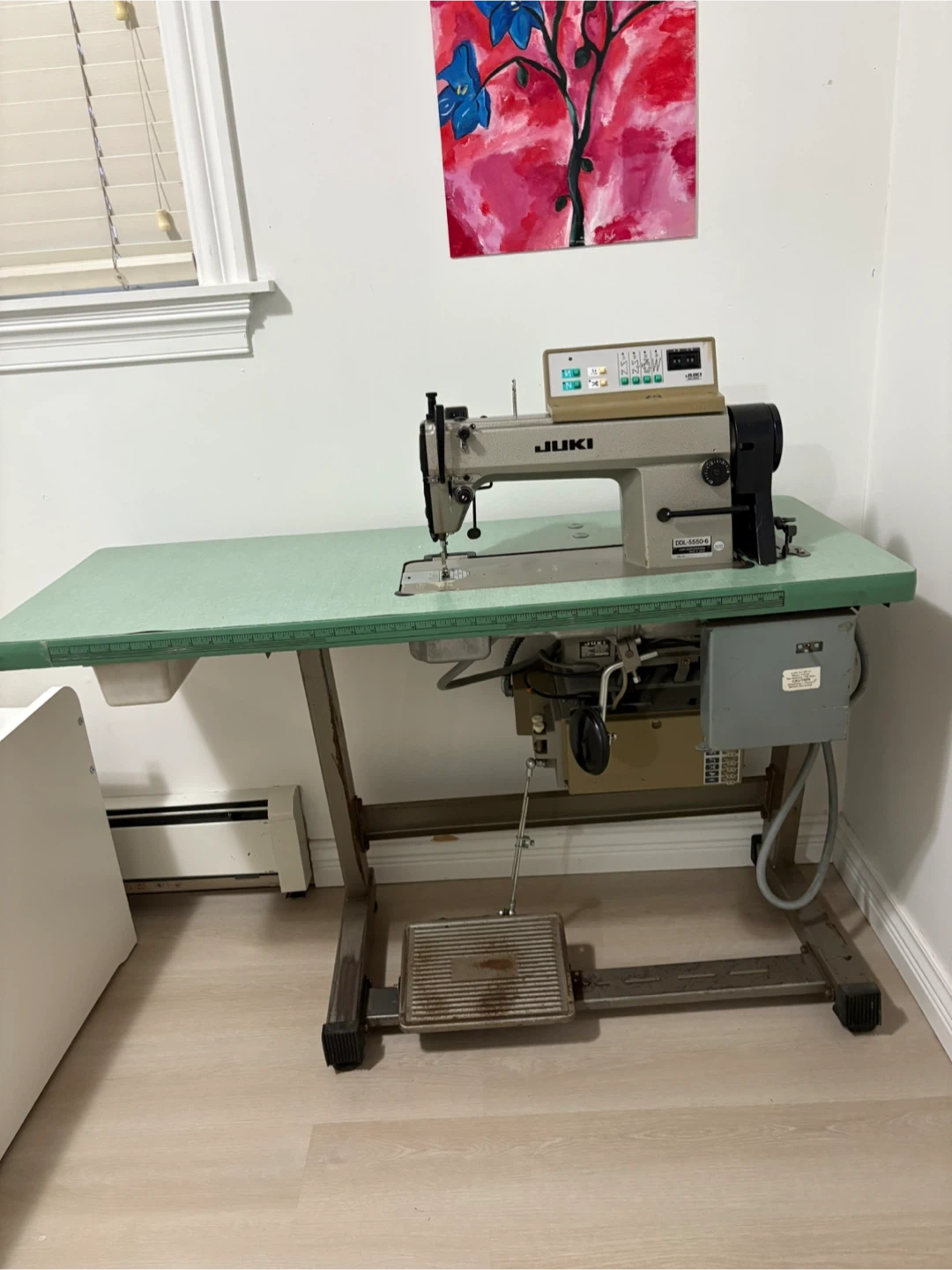 Industrial sewing machine by JUKI, model DDL-5550-6. It's a single needle machine with a control panel for stitch settings. Includes the sewing machine head, table, and motor. It cuts the thread automatically, the speed goes up and down and also the foot pressure is automatic and works perfectly.
